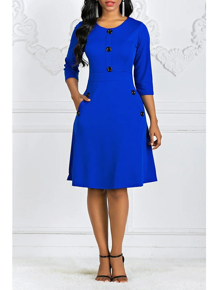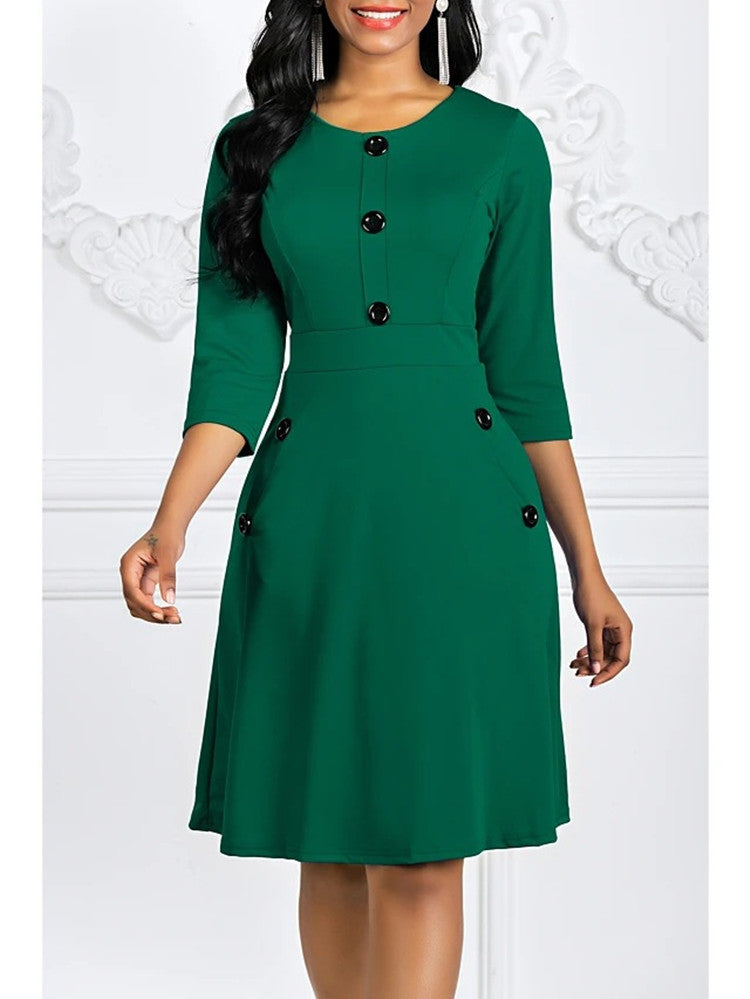 Denne dames A-linie kjole forener stil og elegance i én. Med sit moderne design og praktiske knapdetaljer er det det perfekte valg til fine anledninger og festlige begivenheder.