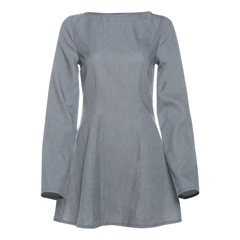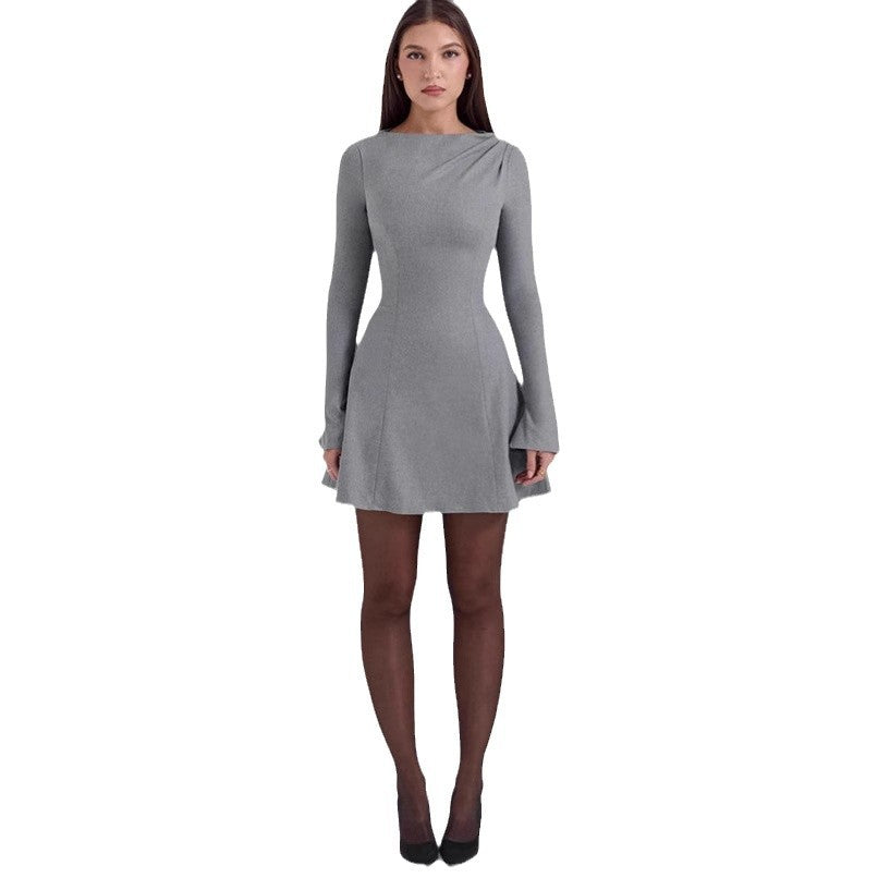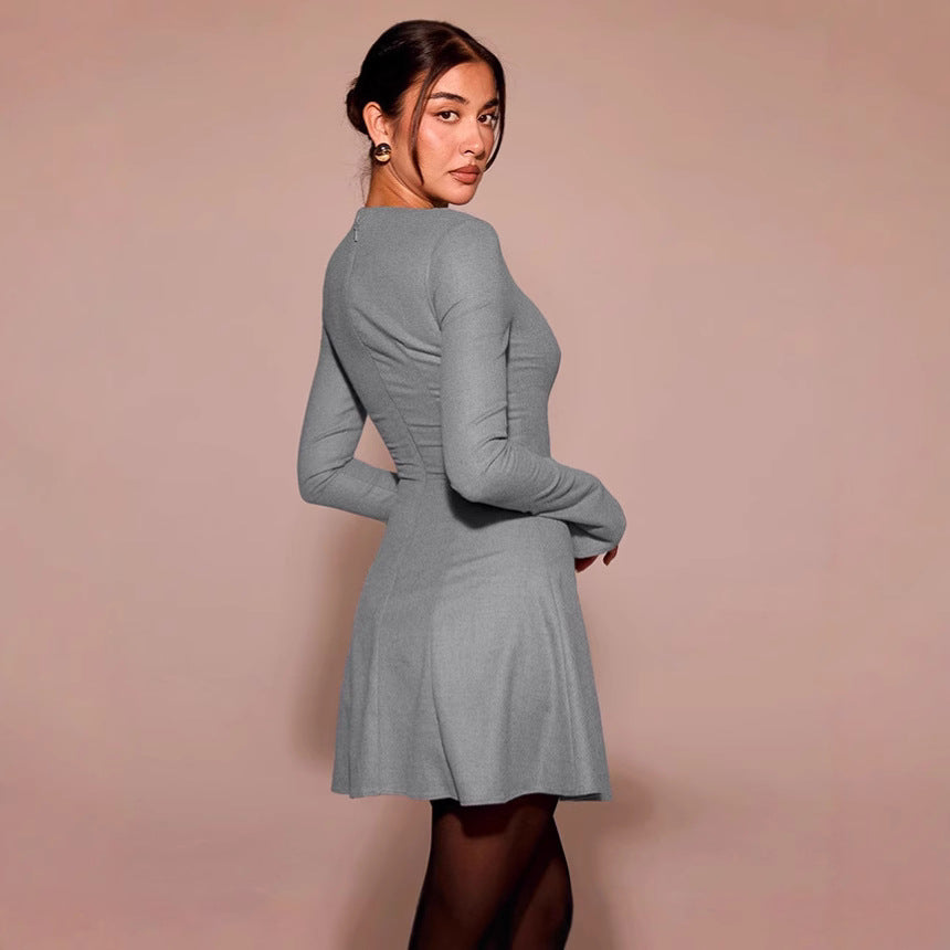 Opdag vores stilfulde dames A-linie kjole, der imponerer med en perfekt blanding af elegance og komfort. Denne kjole har en smigrende rund halsudskæring og lange ærmer, som skaber en feminint silhuet.