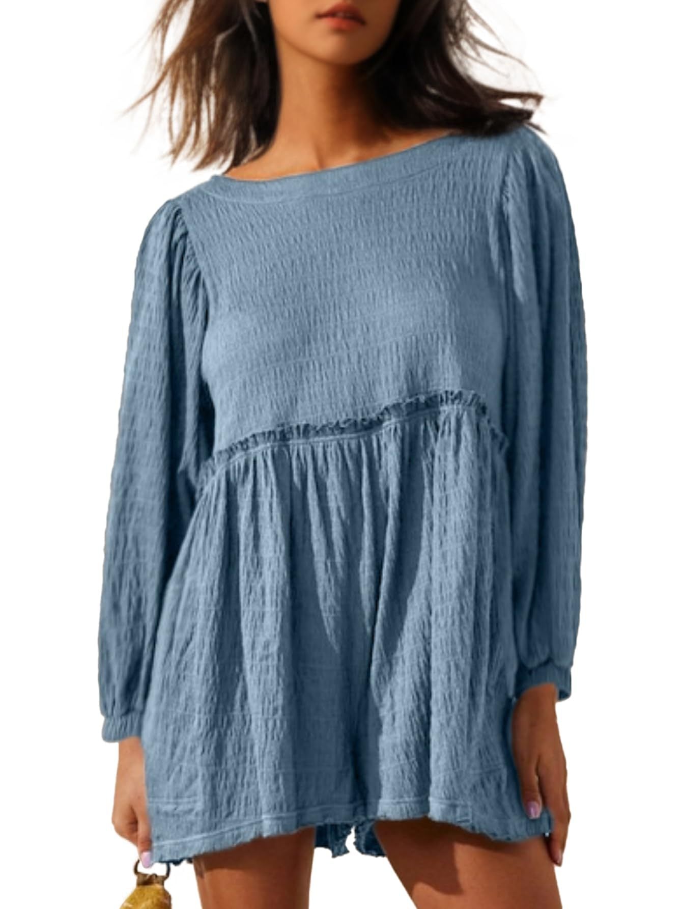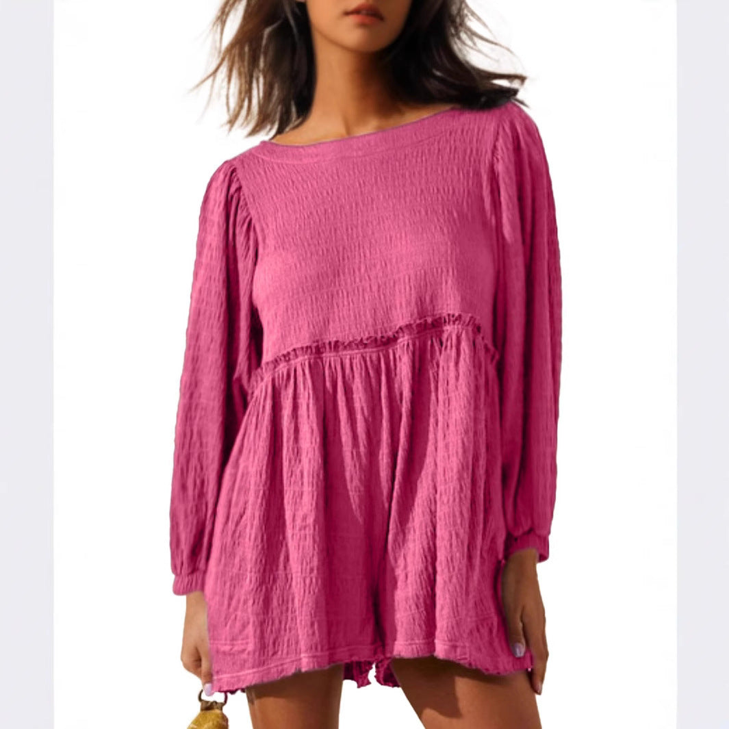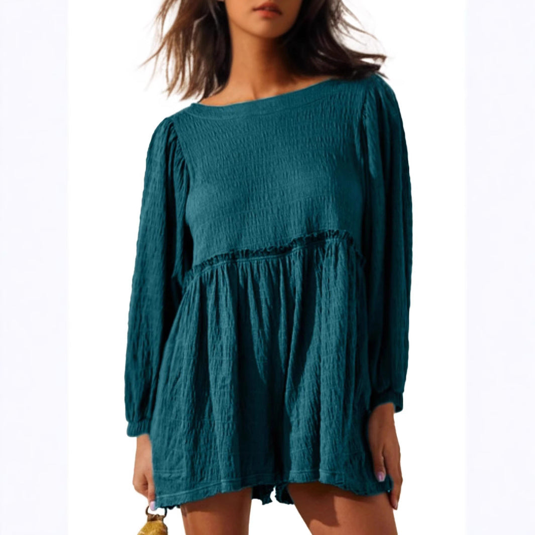 Opdag vores dames afslappede blusekjole med brede ærmer og volanter fra Stilla, der er ideel til afslappede dage og glade anledninger.