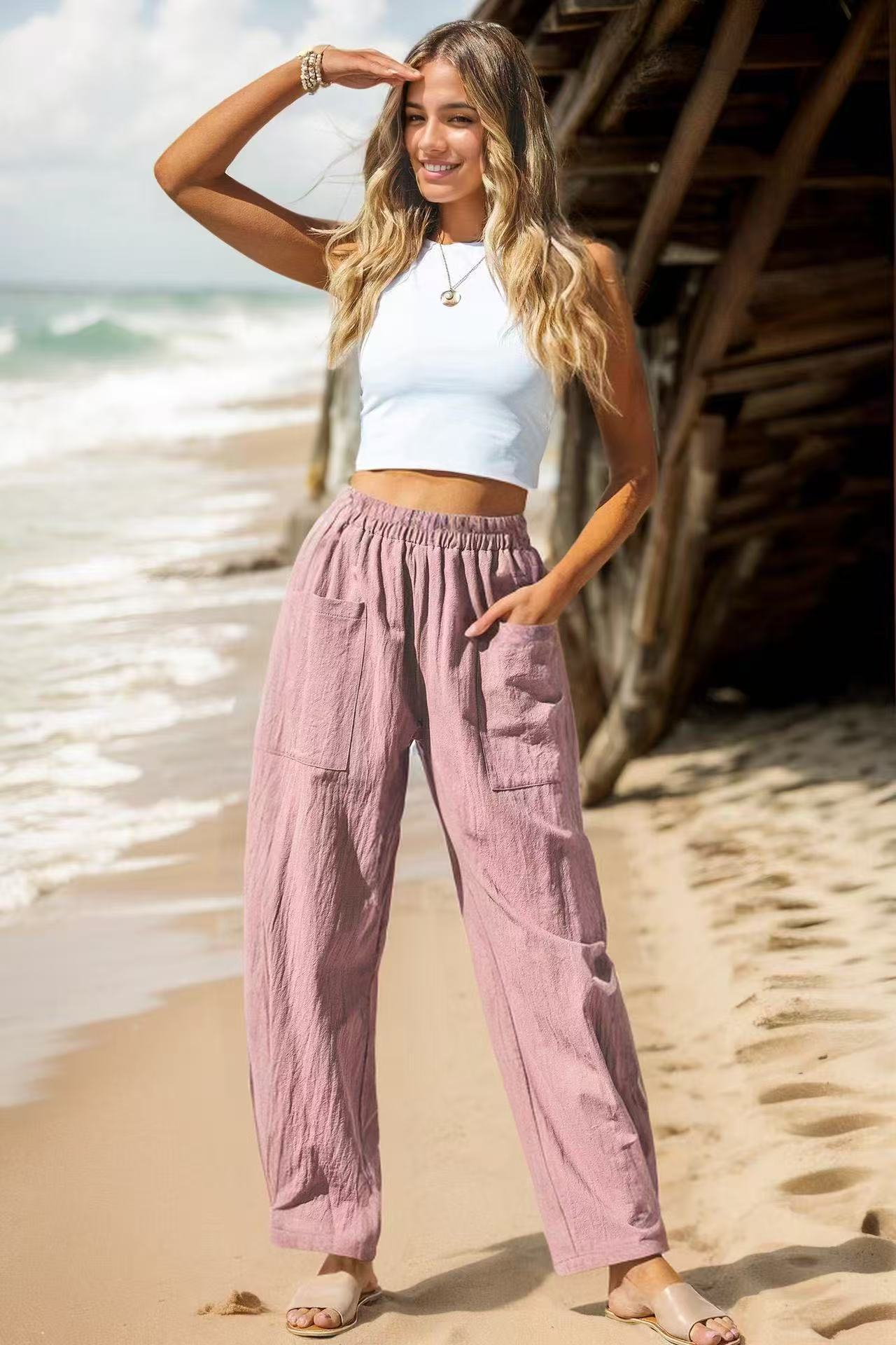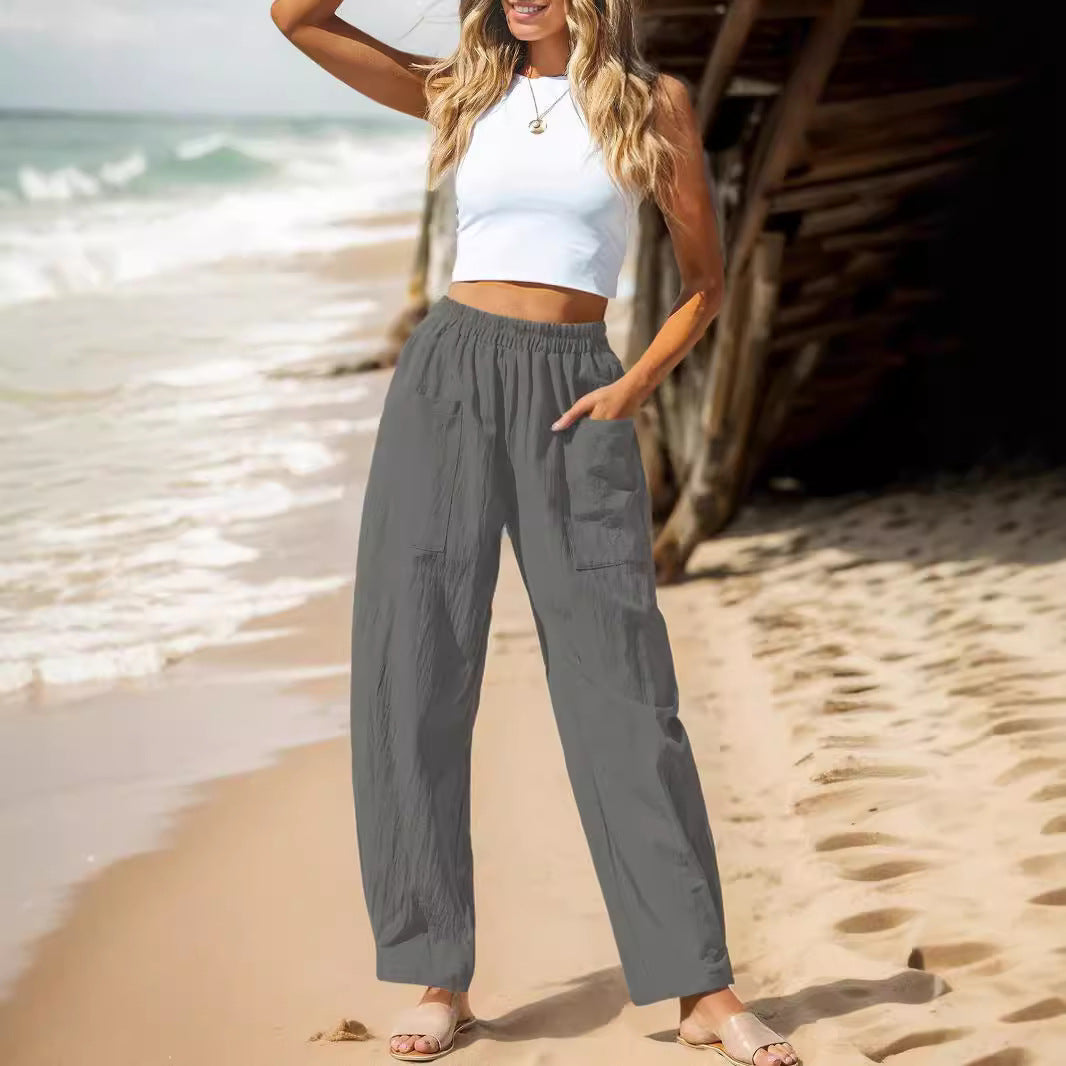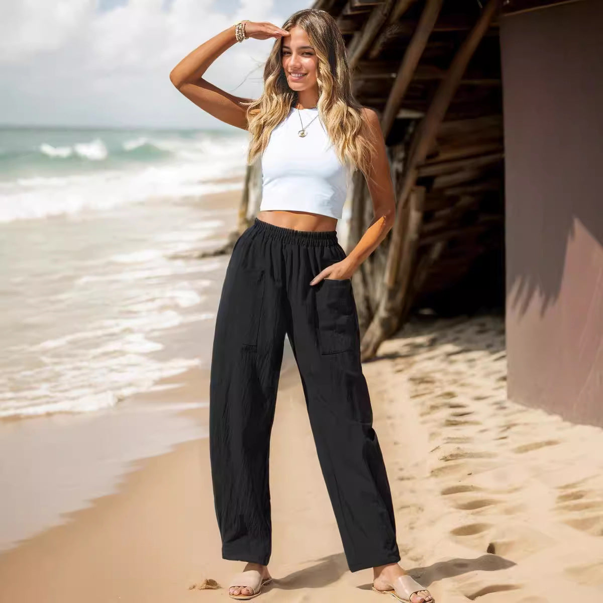 Udforsk den alsidige dames afslappede, brede strandbuks fra Stiila, der er perfekt til afslappede dage på stranden eller i byen. Fremstillet af et let, åndbart materiale, sikrer disse bukser ultimativ komfort og en afslappet silhuet.