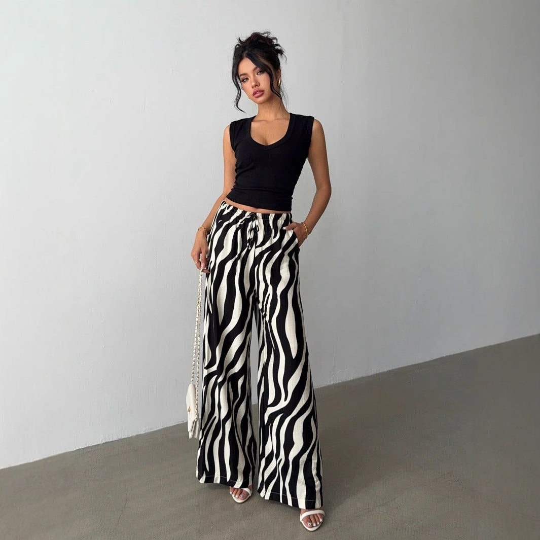 Opdag vores damers afslappede buks med zebra-mønster, der sikrer et trendy udseende og høj bærekomfort. Disse vide bukser tilbyder ikke kun alsidighed, men også stil i enhver lejlighed.