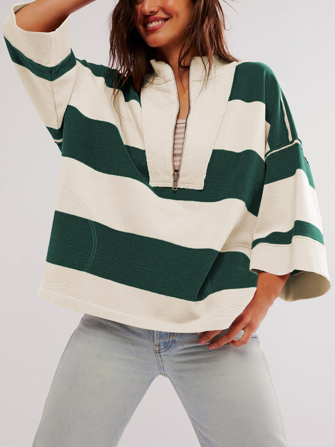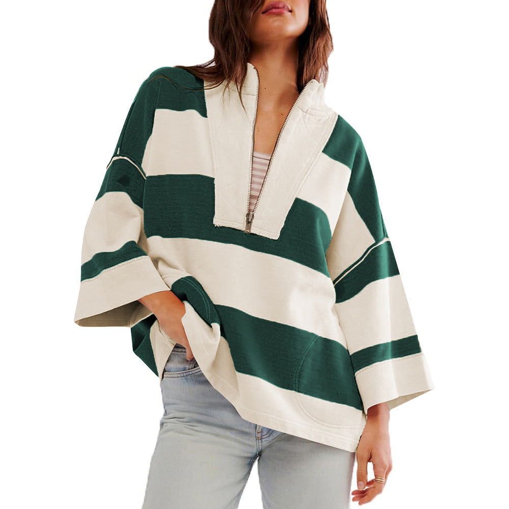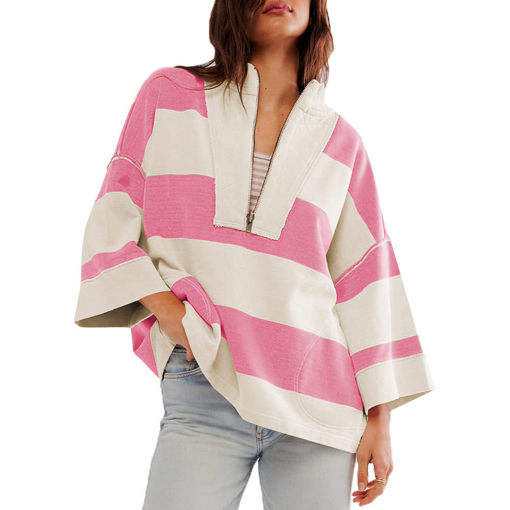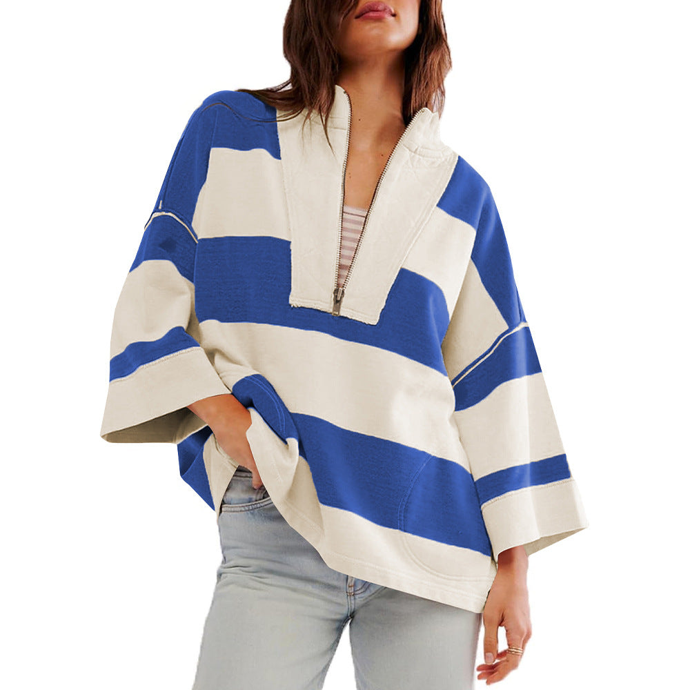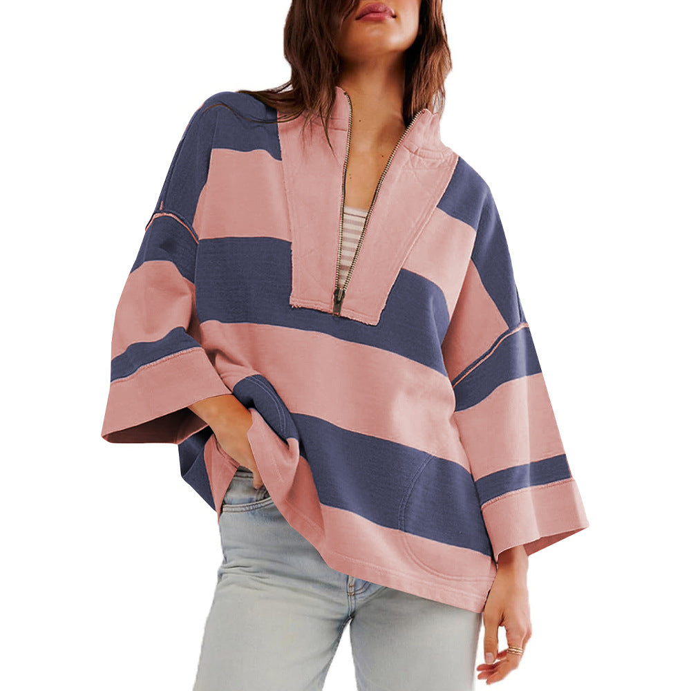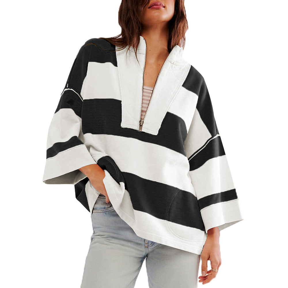 Denne stilfulde dames hoodie kombinerer komfort og trendy design. Med sin modiske ståkrave og det unikke brede stribemønster er denne trøje perfekt til afslappede aktiviteter eller hyggelige dage derhjemme.