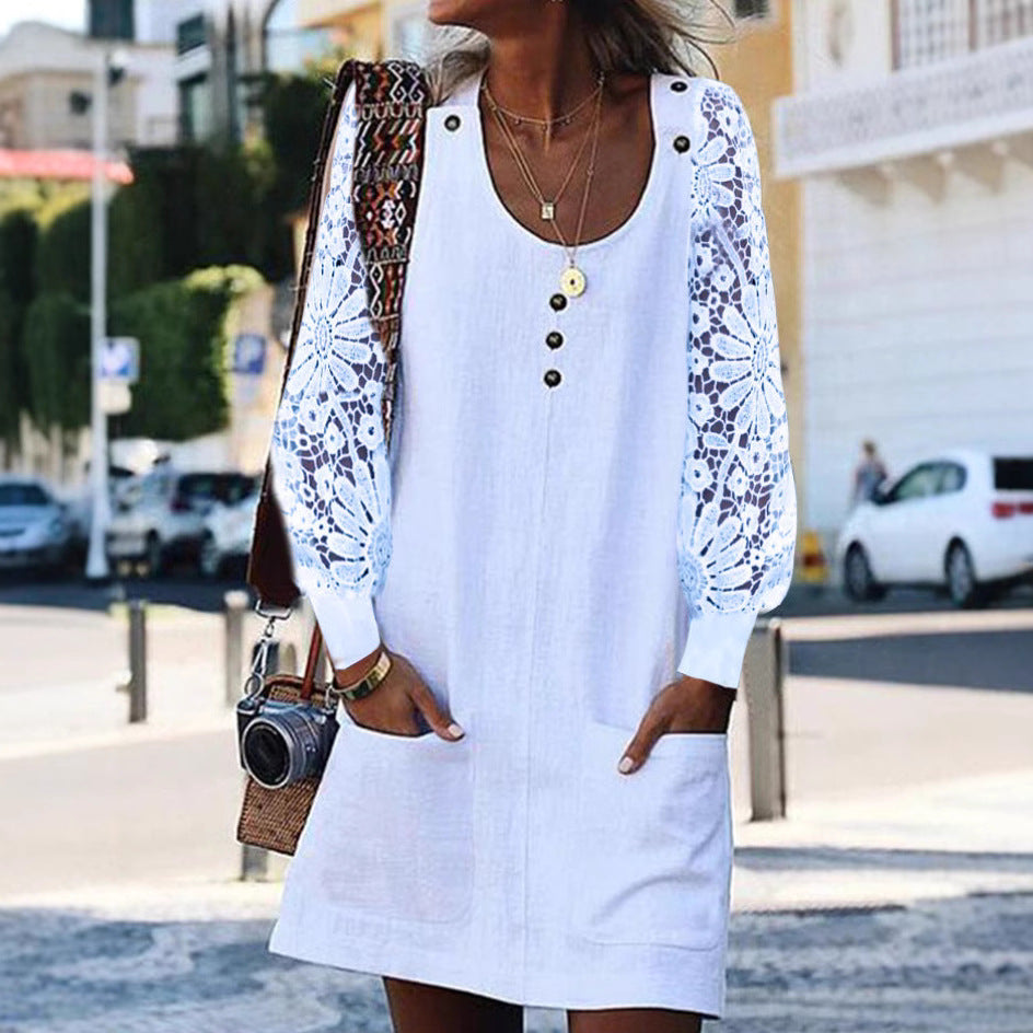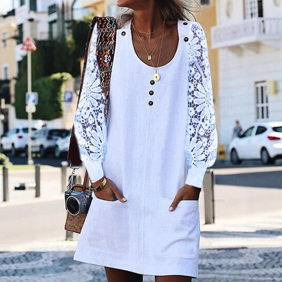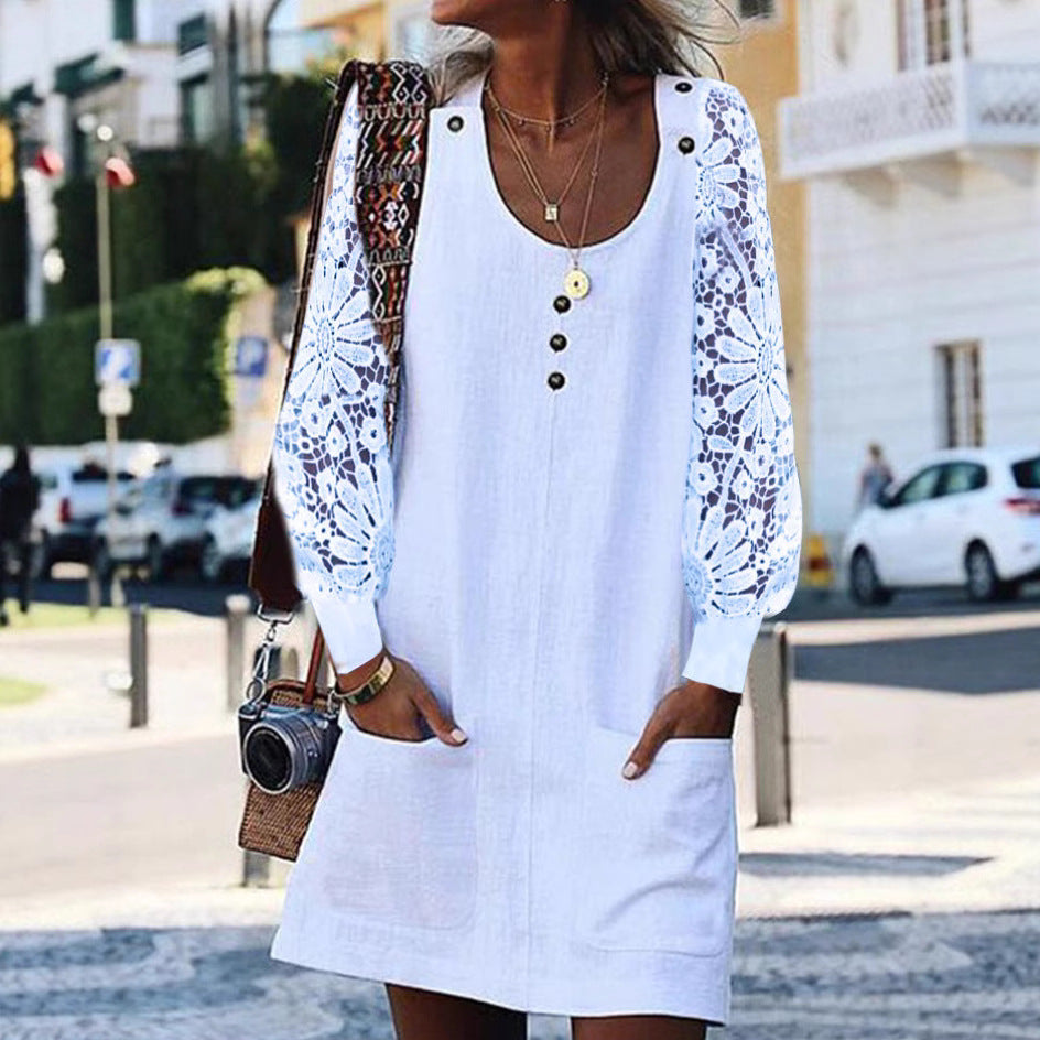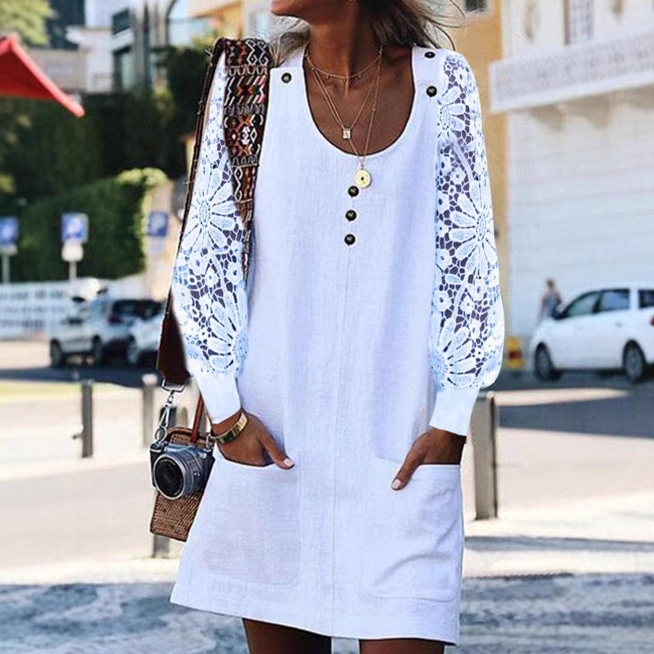 Oplev vores afslappede kjole til damer med fine spidsærmer, der giver dig både komfort og stil. Denne kjole er perfekt til forskellige anledninger, fra en afslappet dag i byen til festlige fejring.