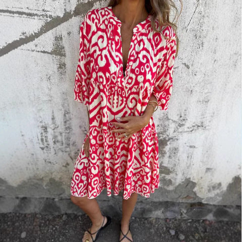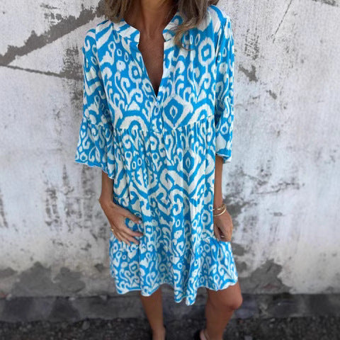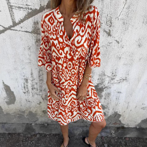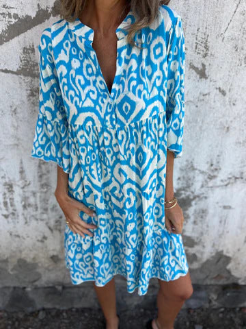 Opdag vores trendy, afslappede kjole med V-hals og et unikt, dekorativt mønster. Denne kjole er den perfekte følgesvend til solrige dage og er ideel til afslappede eftermiddage eller særlige begivenheder.