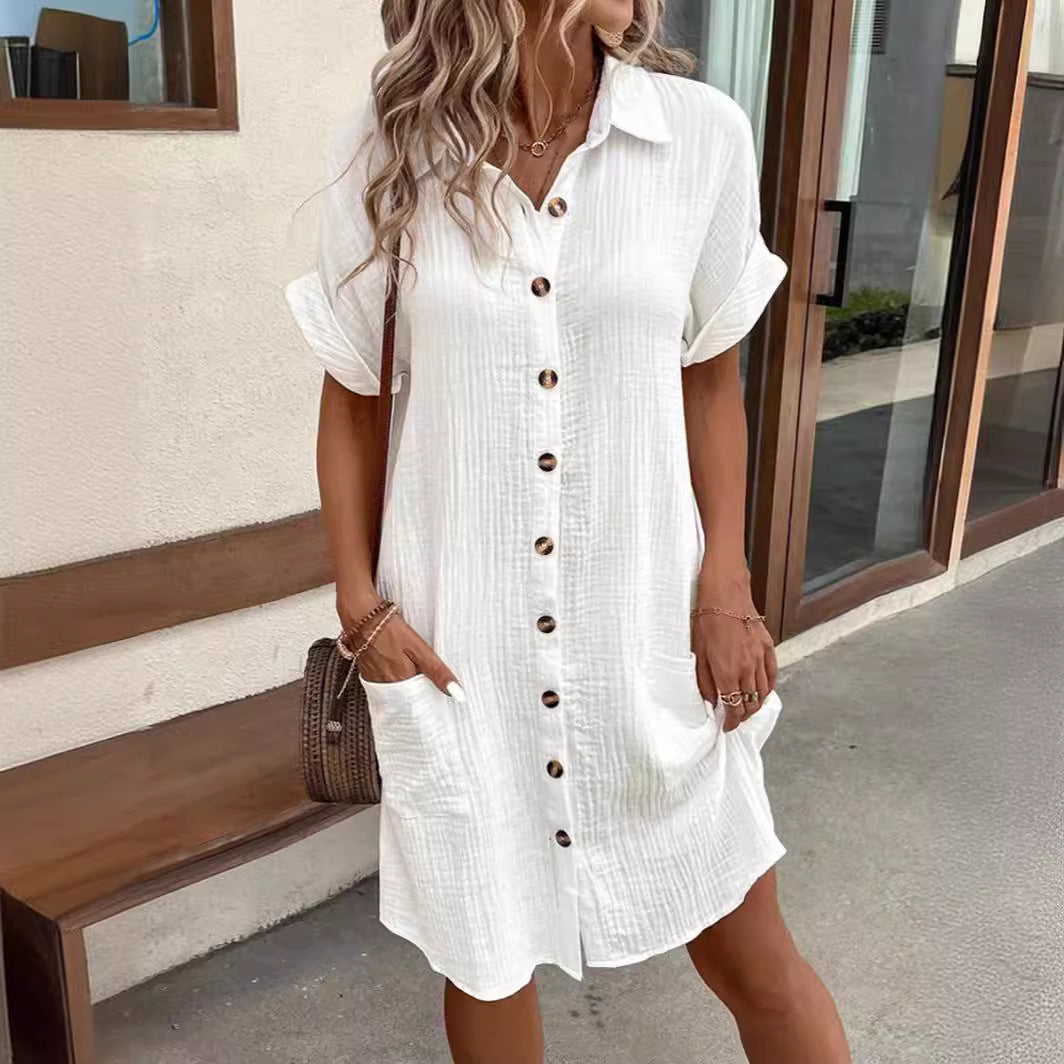 Oplev vores dames afslappede knapkjole lavet af let bomuld, perfekt til afslappede sommerdage. Denne kjole kombinerer stil med komfort og tilbyder en alsidig brug til forskellige anledninger.