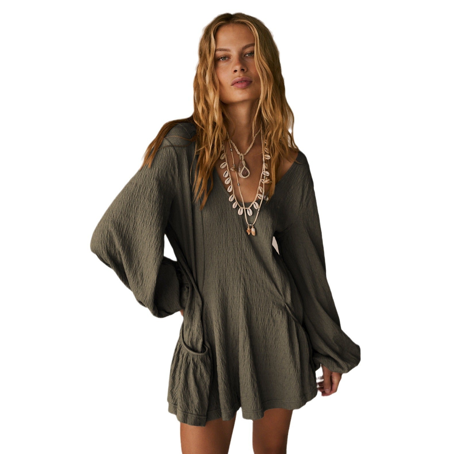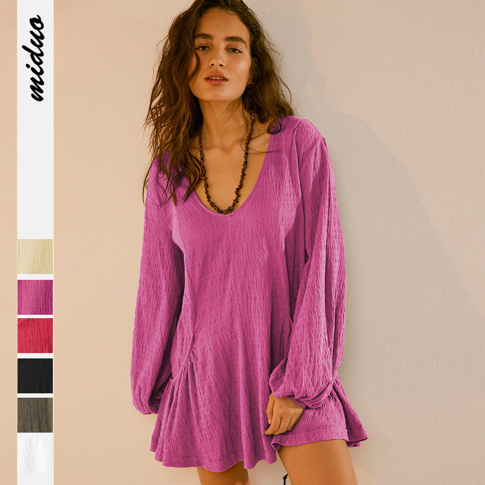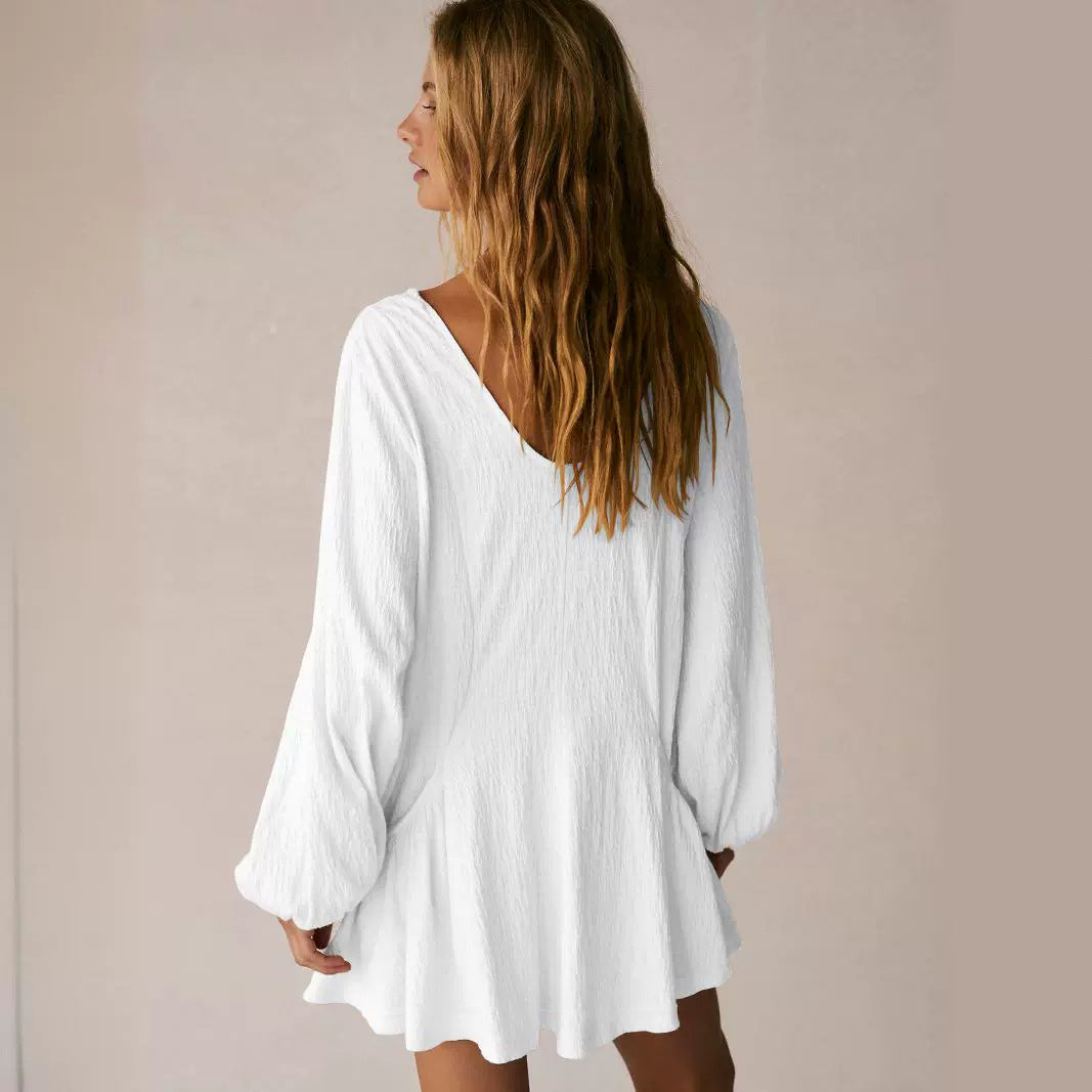 Opdag den perfekte kjole til afslappede sommerdage! Dette dameløse kortærmede kjole forener stil og komfort. Med en dyb V-hals og elegante lange ærmer er det ideelt til forskellige anledninger og det perfekte valg til varme dage.
