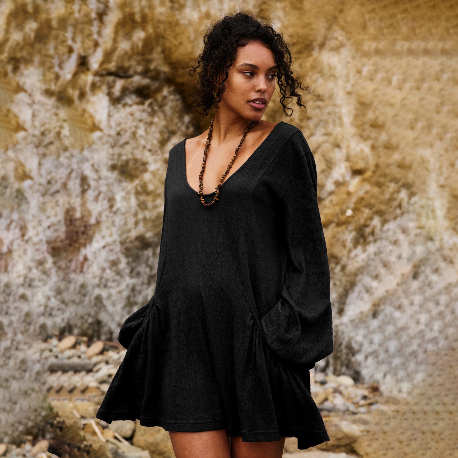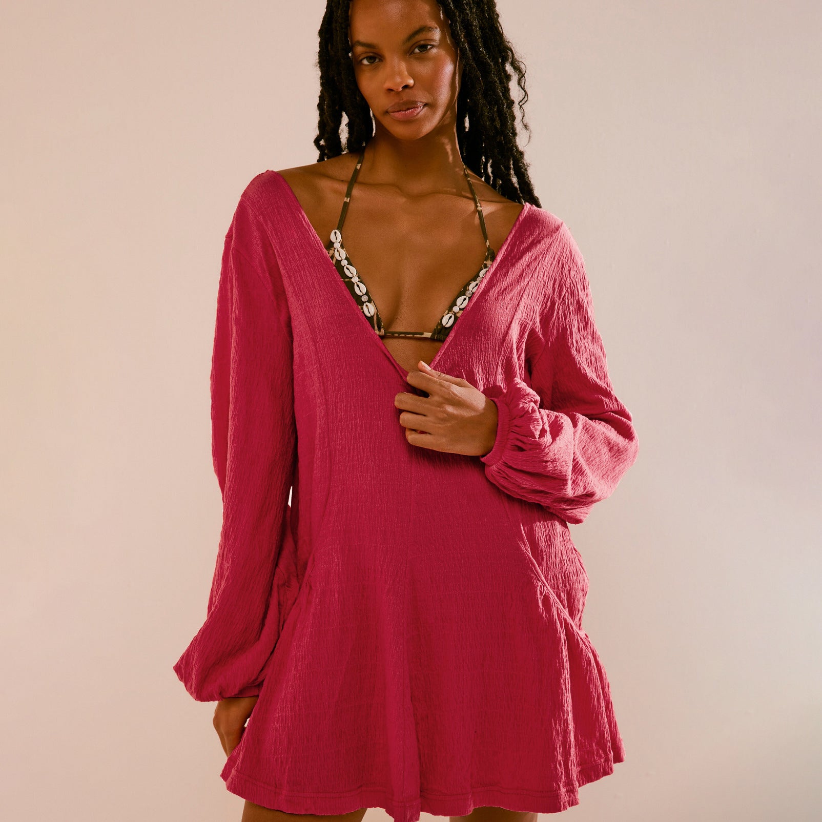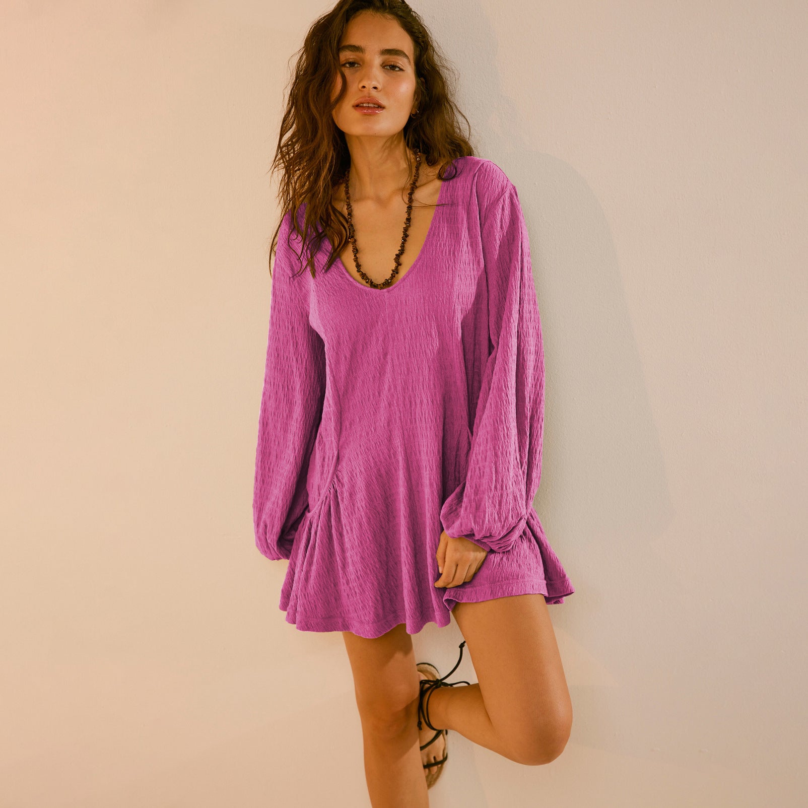 Opdag den perfekte kjole til afslappede sommerdage! Dette dameløse kortærmede kjole forener stil og komfort. Med en dyb V-hals og elegante lange ærmer er det ideelt til forskellige anledninger og det perfekte valg til varme dage.