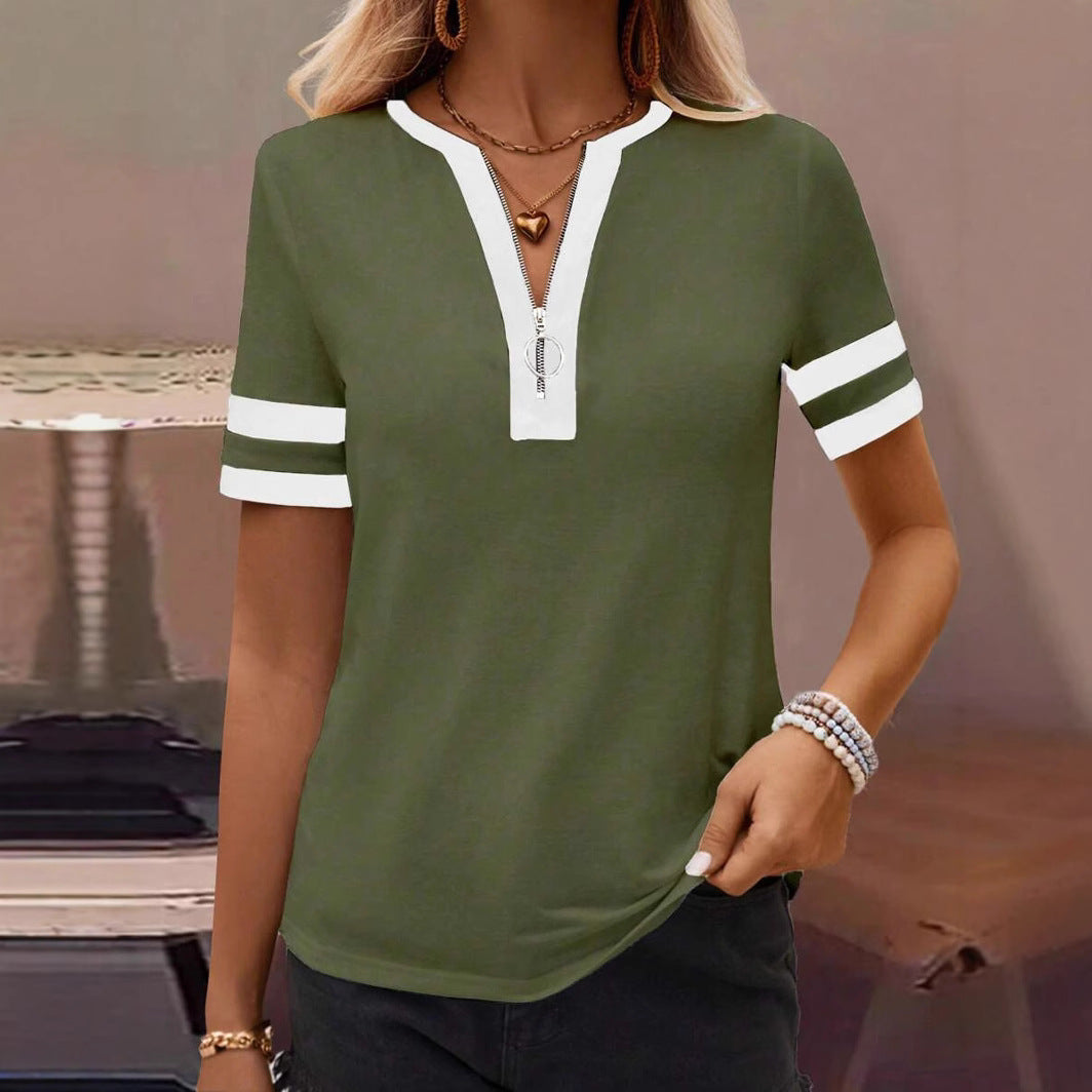 Opdag vores afslappede kortærmede skjorte til damer, der imponerer med en trendy lynlås og et sportigt design. Perfekt til de varme dage, kan denne overdel kombineres på mange måder – hvad enten det er til fritidsaktiviteter, i hverdagen eller til en afslappet sammenkomst med venner.