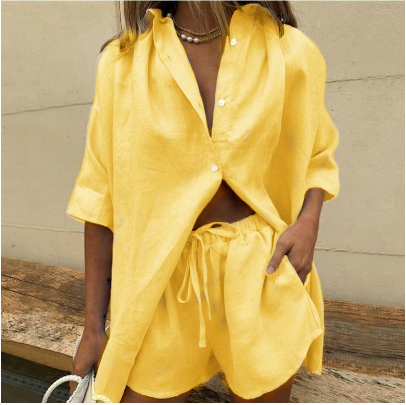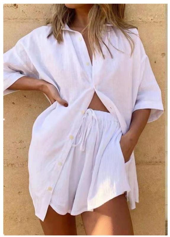 Oplev den perfekte kombination af stil og komfort med vores afslappede sæt med korte ærmer til damer. Dette sæt består af en blød bluse med en praktisk knaplukning og et behageligt shorts med gummibånd, som er ideelle til varme dage.