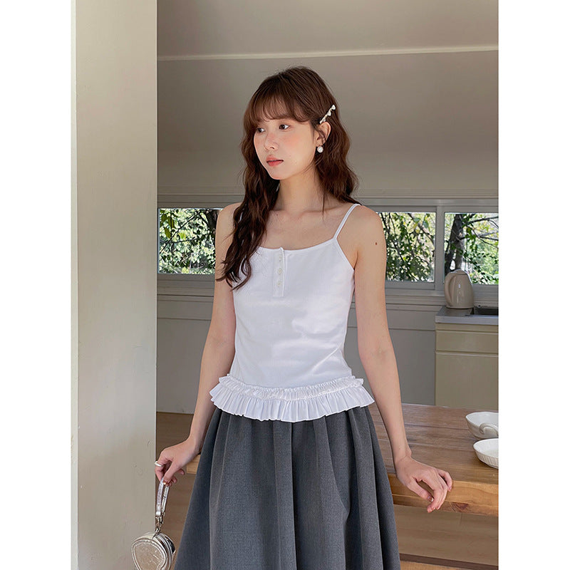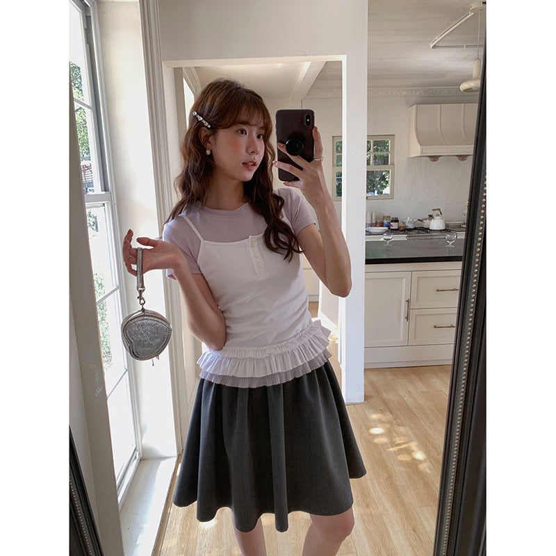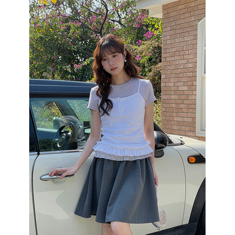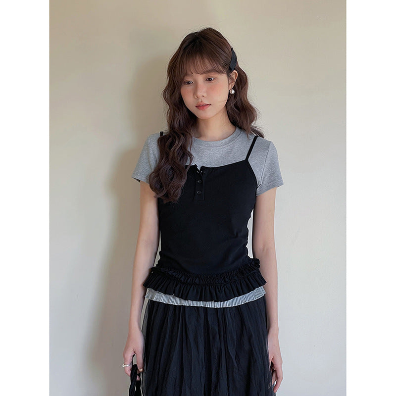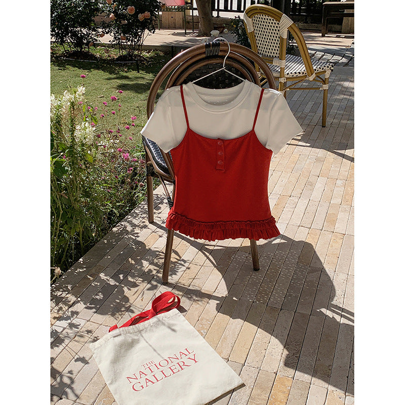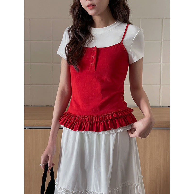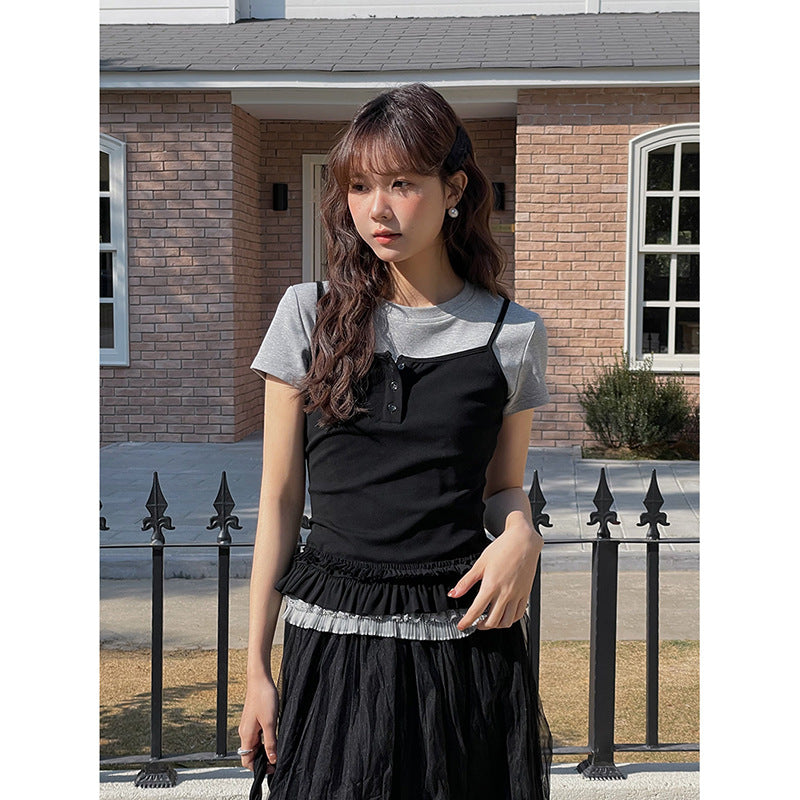 Opdag vores charmerende dames layering-top med flæsekant, det perfekte tøj til et afslappet, elegant look. Dette alsidige top kombinerer et moderne kortærmet design med et stilfuldt spaghetti-strop top og tilføjer en legesyg note til ethvert outfit.