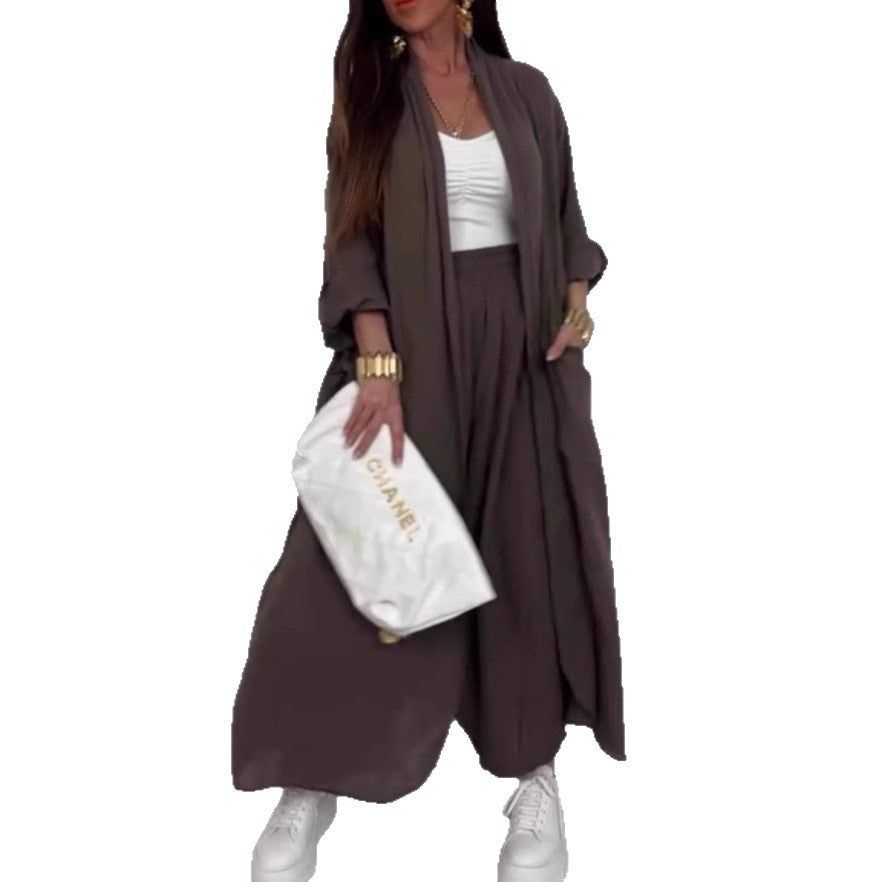Opdag vores dames afslappede longjakke-sæt lavet af et højkvalitets, let stof, perfekt til afslappede anledninger eller dovne dage. Dette sæt kombinerer stil med maksimal komfort.