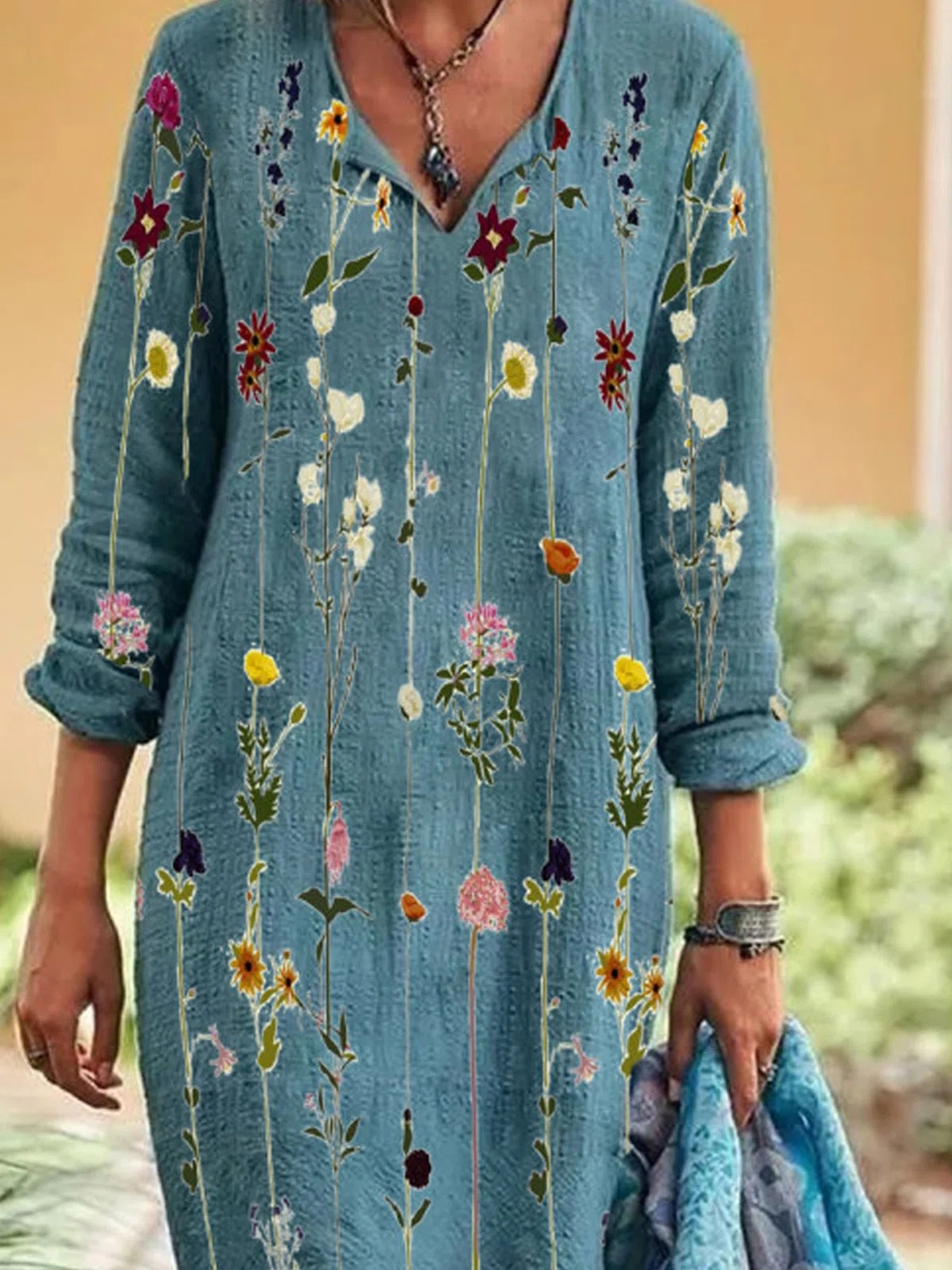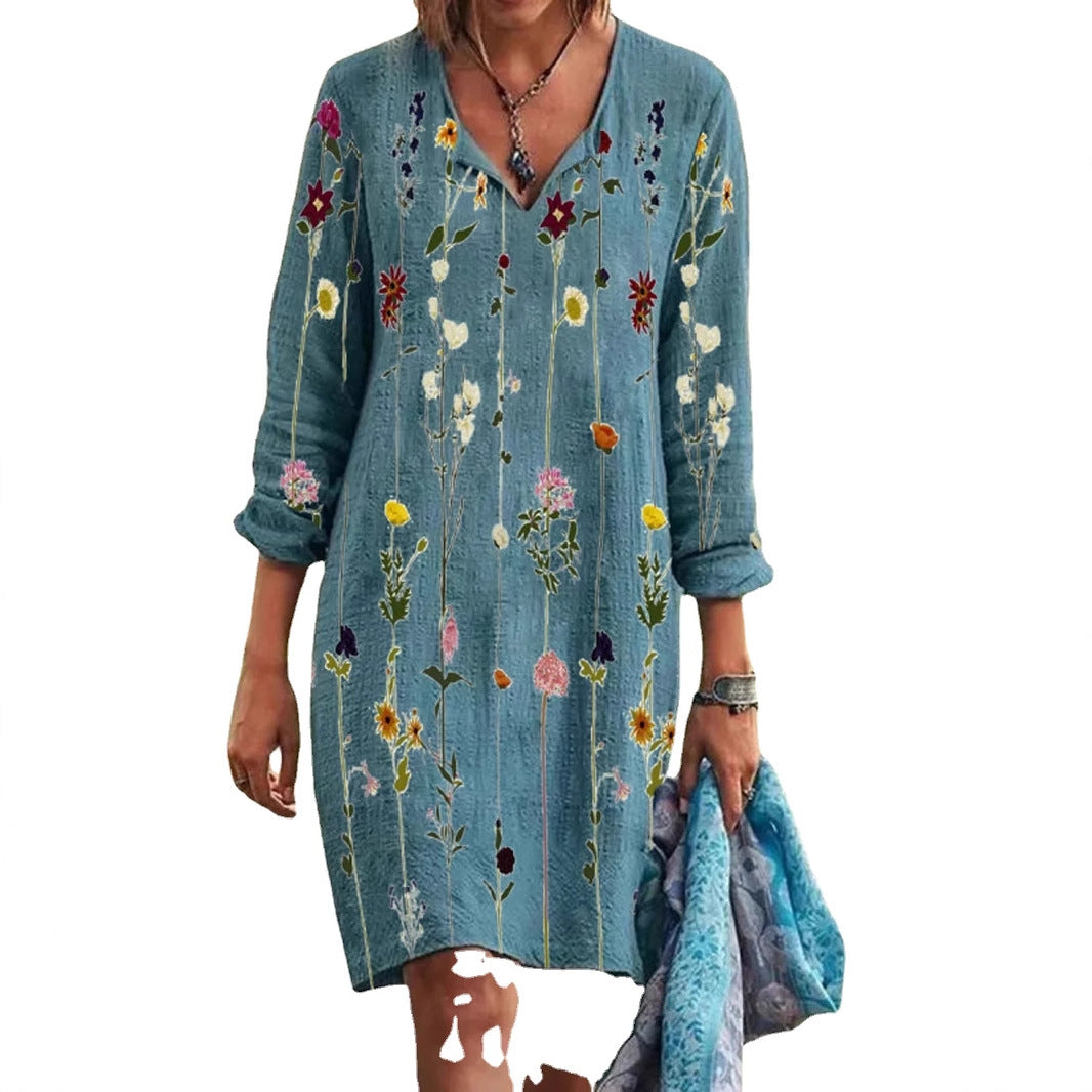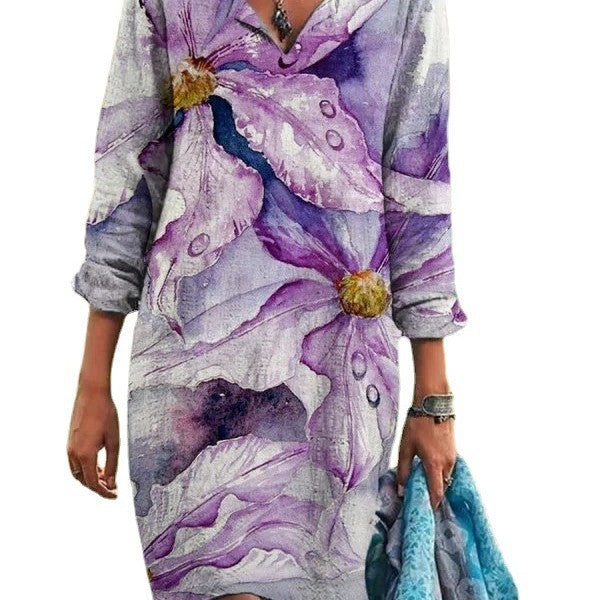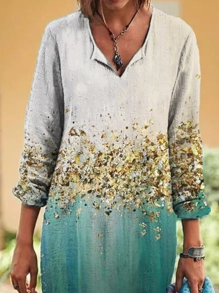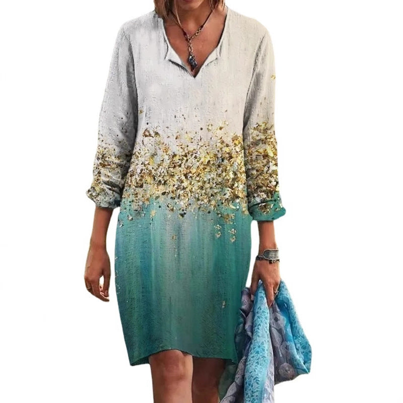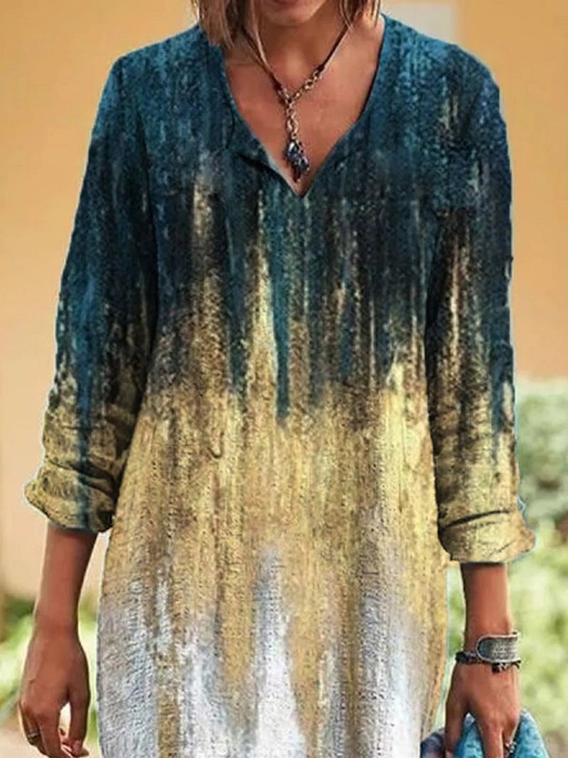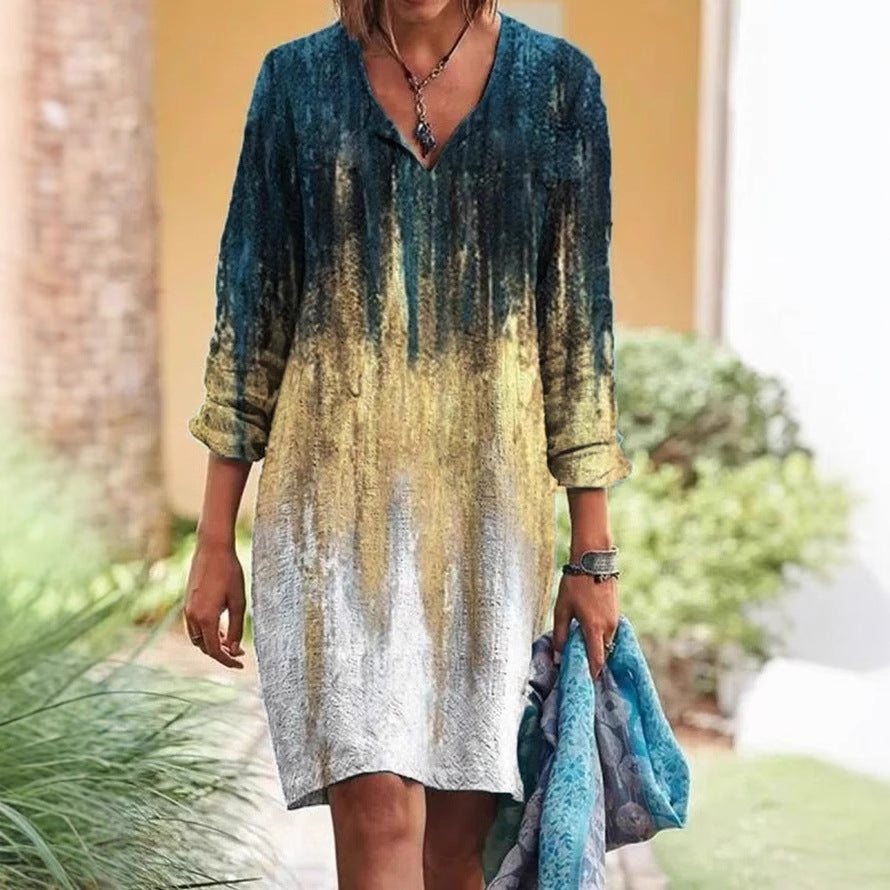 Opdag vores dames afslappede langærmede kjole, der imponerer med en dyb V-udskæring og en unik farvegradient. Denne kjole forener komfort og stil, ideel til forskellige lejligheder.