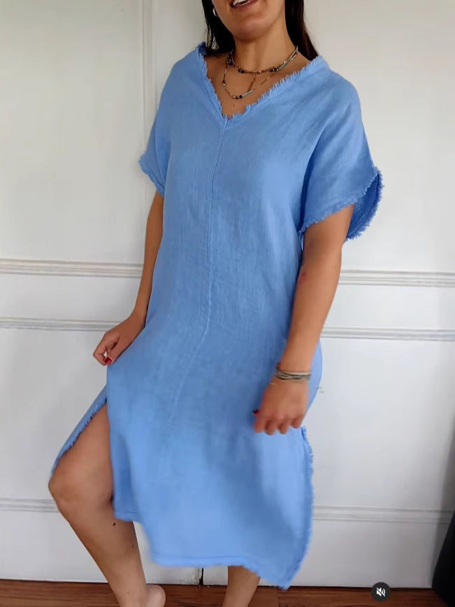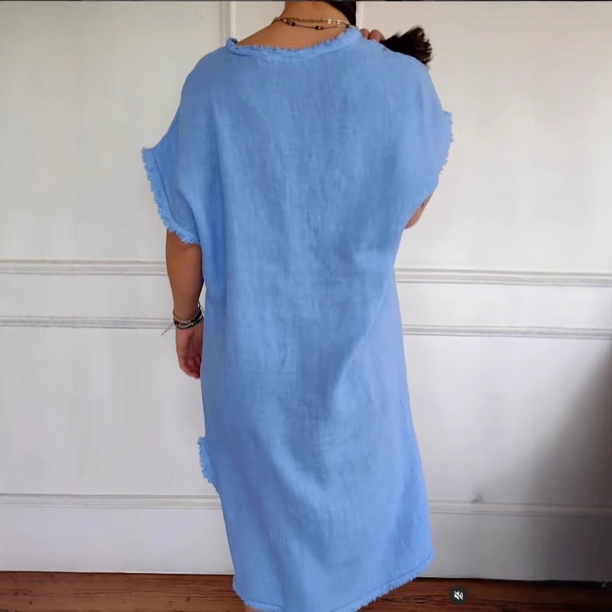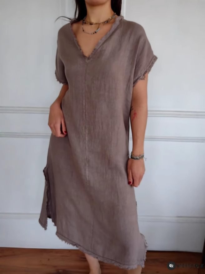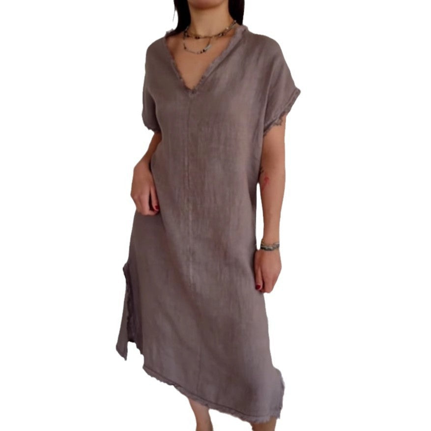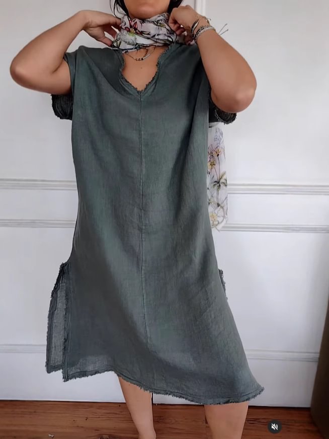 Denne elegante kjole til kvinder i højkvalitets linned forener stil og komfort. Den er ideel til varme sommerdage eller afslappede aftener. Med en moderne V-udskæring og en uregelmæssig søm får den et unikt strejf, der giver dit look det lille ekstra.