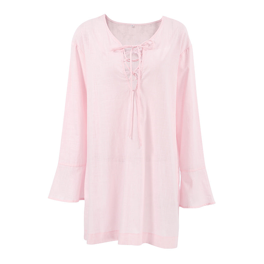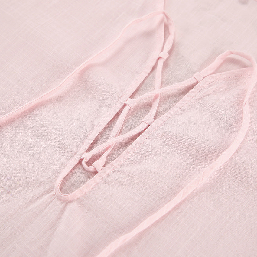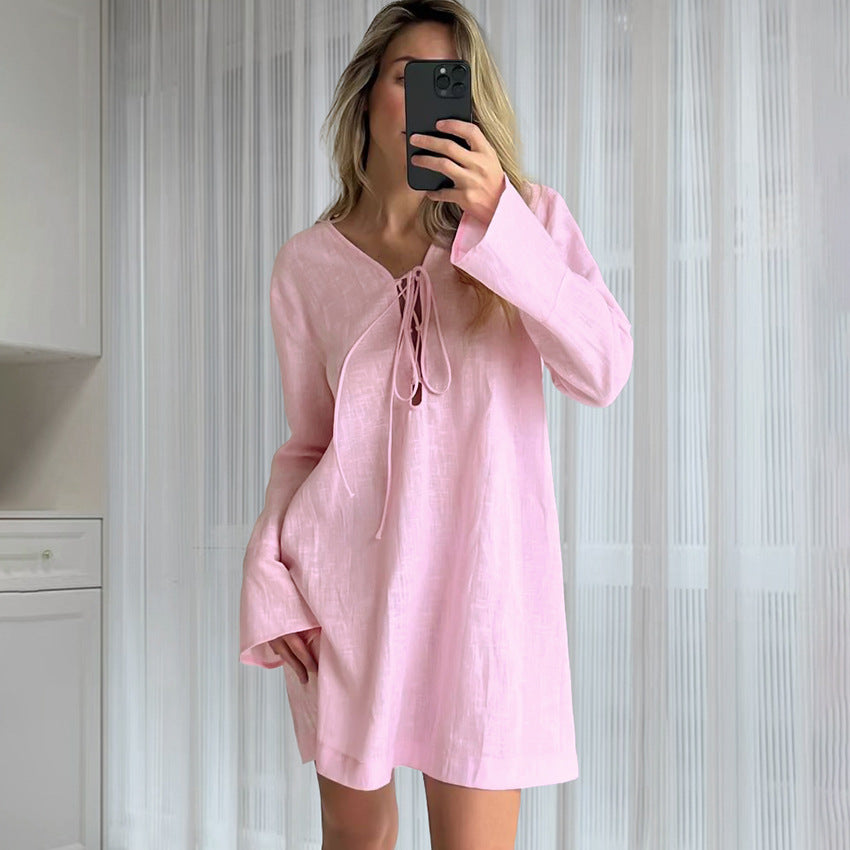 Opdag vores damesurrede linned-minikjole med legende snøredesign, der er ideel til afslappede sommerdage og uformelle aftener. Fremstillet af høj kvalitet, åndbart linned, tilbyder denne kjole en behagelig bæreoplevelse og en let, luftig pasform.