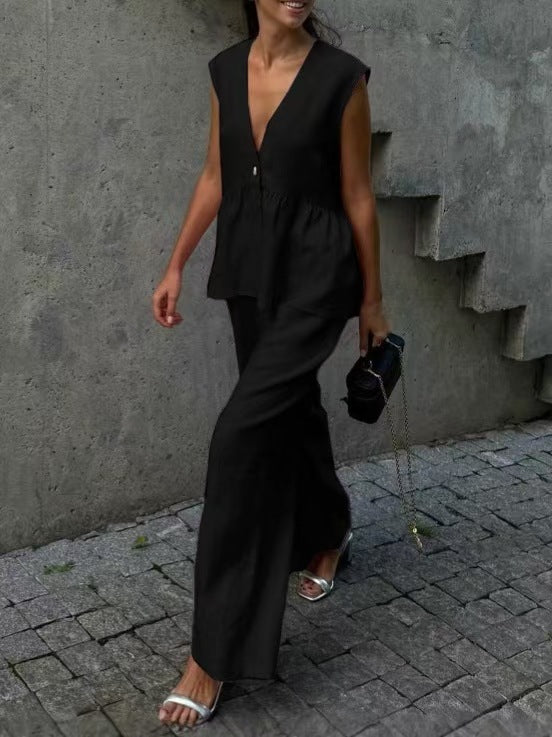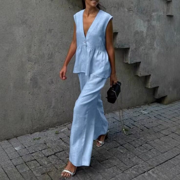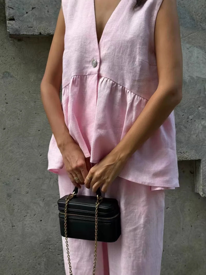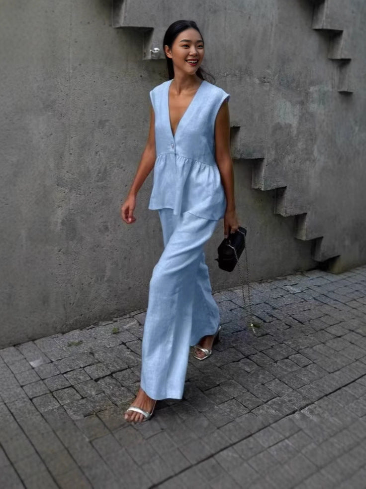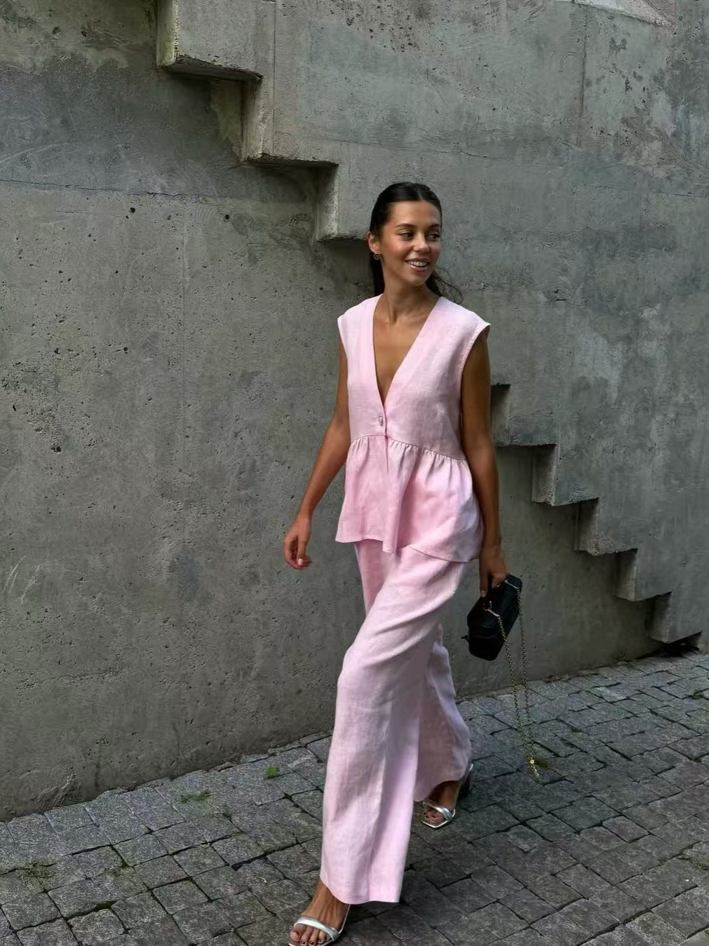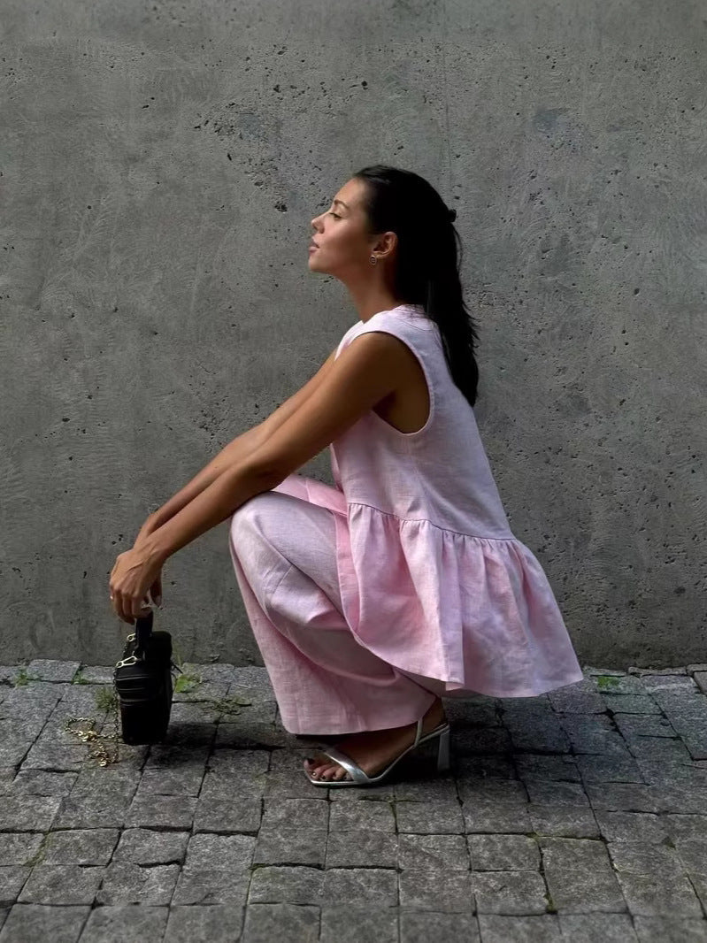 Oplev ultimat komfort og ubesværet elegance med dette dameløse linned sæt fra Stiila. Dette modeudtryk består af en ærmeløs top og løse bukser, perfekt til varme sommerdage og afslappede lejligheder.