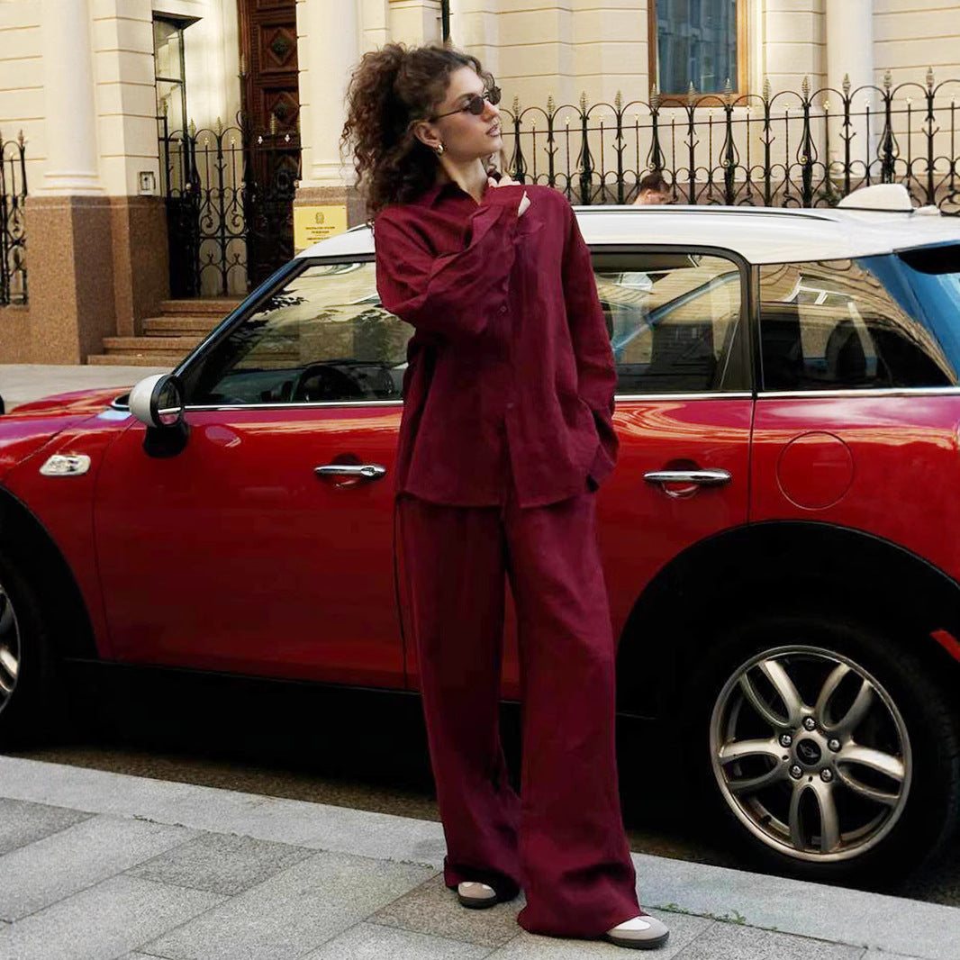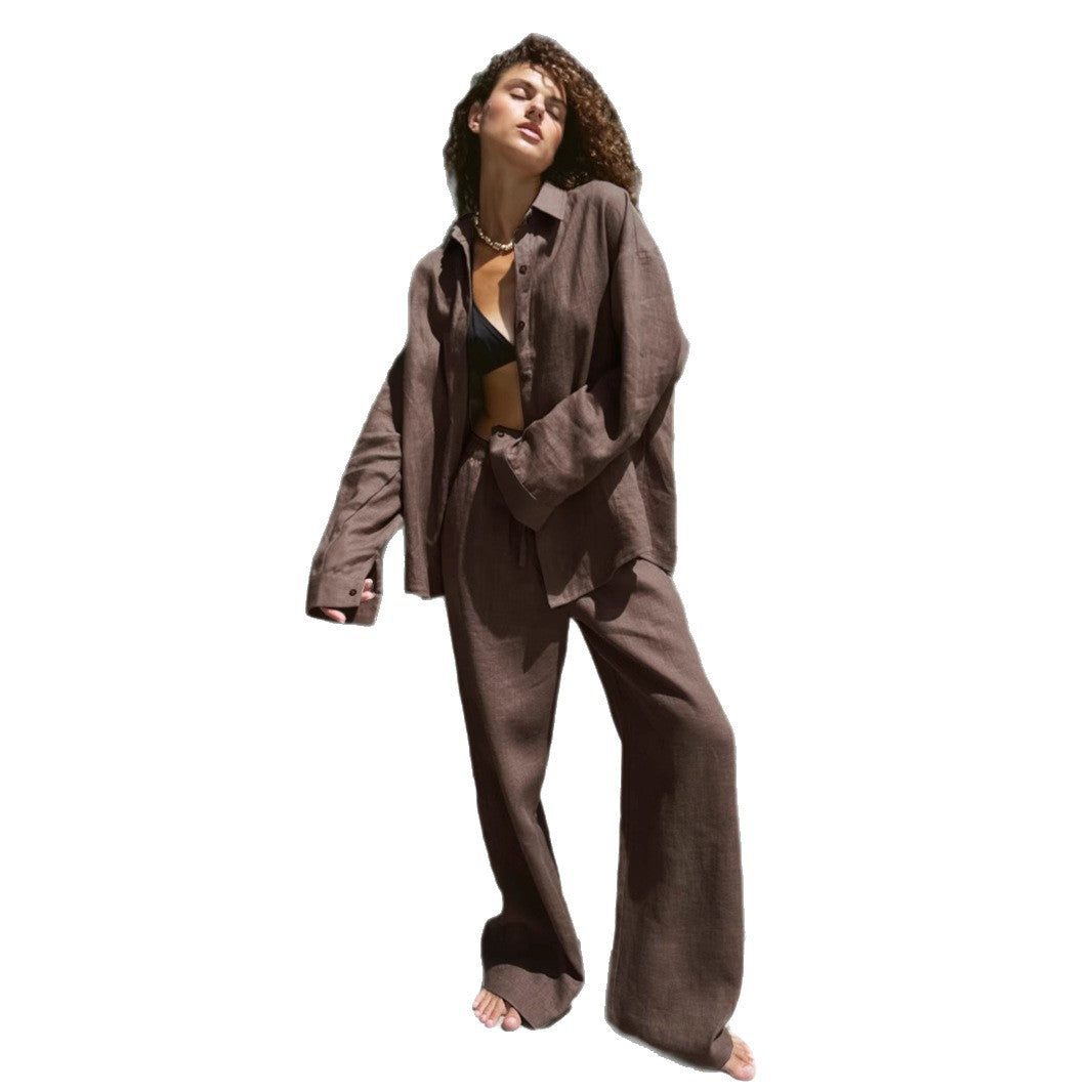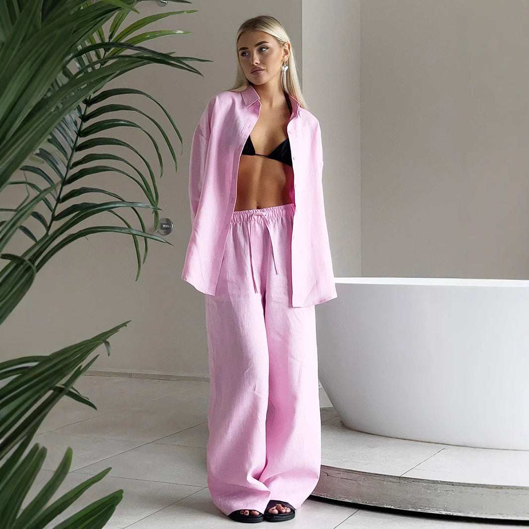 Opdag det ultimative sommerlook med vores afslappede linneddragt til damer. Denne stilfulde dragt kombinerer en oversized skjorte med et par afslappede bukser, som tilsammen giver et afslappet og elegant look.