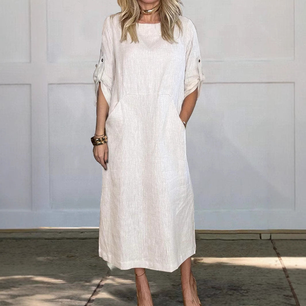 Opdag vores dames afslappede linnedkjole med praktiske lommer fra Stilla, der forener både stil og komfort. Denne kjole er det perfekte valg til forskellige anledninger, hvad enten det er et afslappet møde med venner eller en afslappet dag i haven.