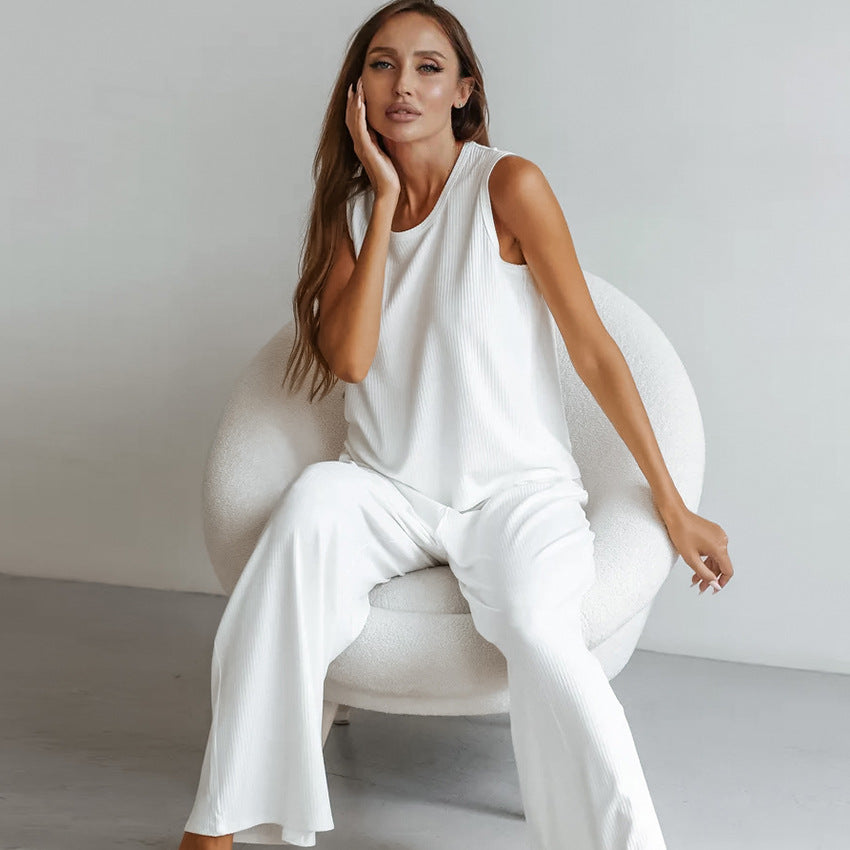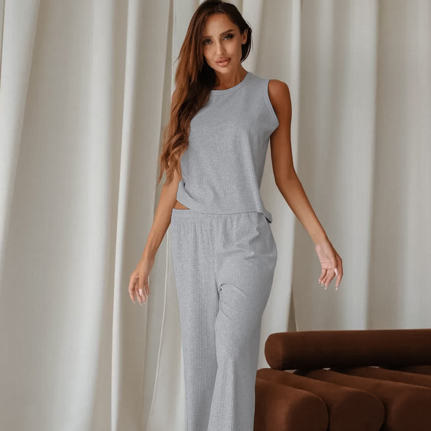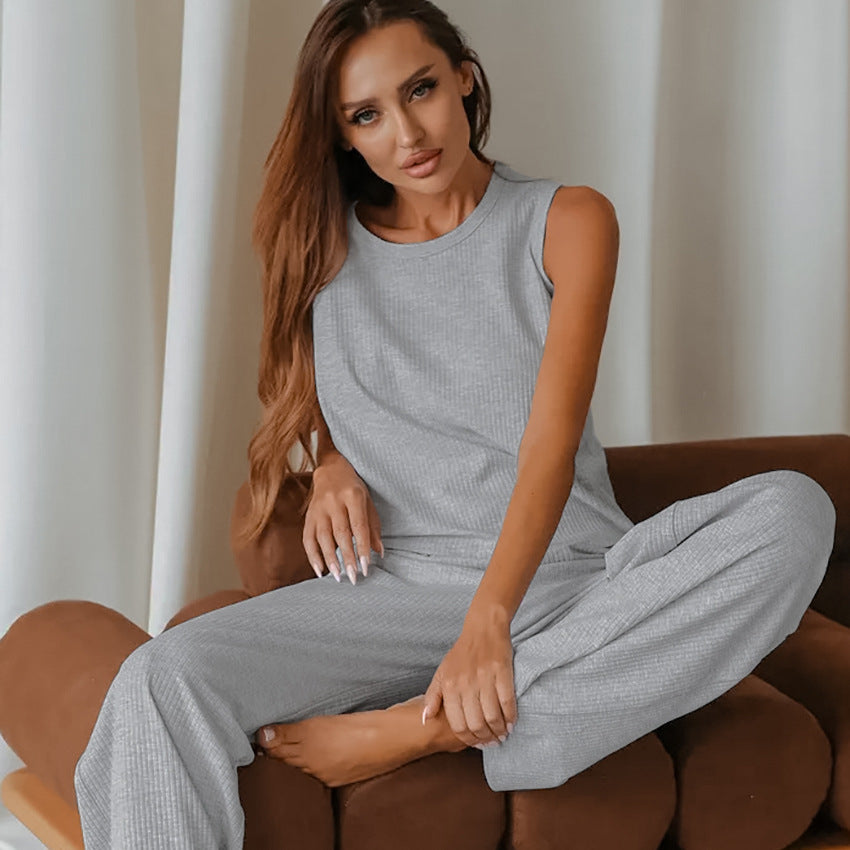 Opdag vores stilfulde damelounge-sæt lavet af høj kvalitets ribstrik, der kombinerer perfekt komfort og trendy design. Dette sæt består af en ærmeløs top og et løstsiddende par bukser, ideelt til afslappede dage derhjemme eller hyggelige udflugter.
