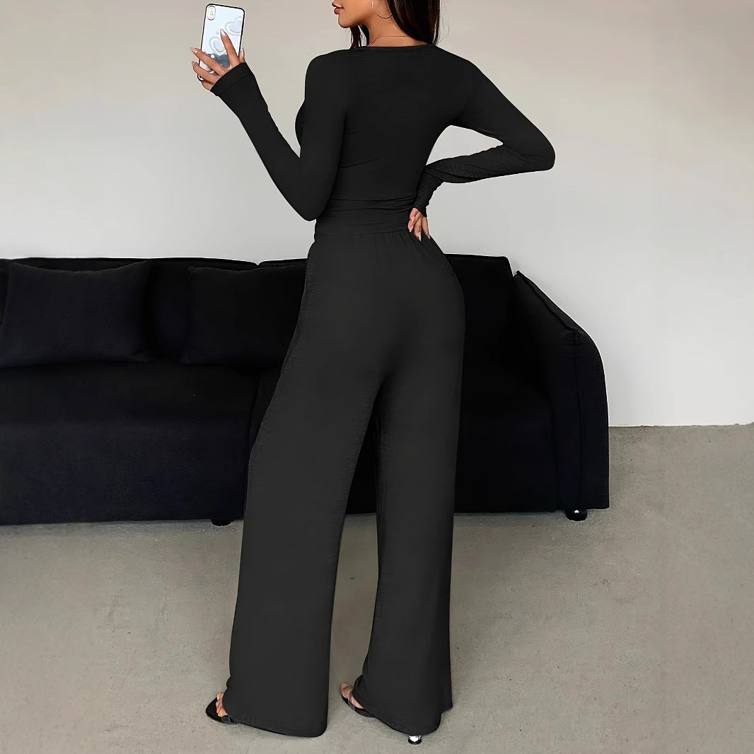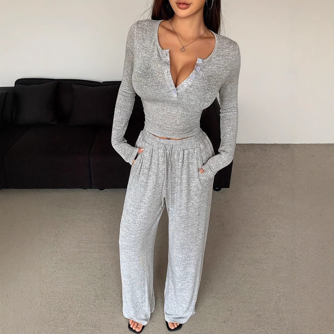 Opdag vores elegante dames lounge-sæt, der forener komfort og stil i én. Dette sæt består af en afslappet, højt skåret top med diskrete knapdetaljer og en moderne V-udskæring, der giver outfittet et feminint præg.
