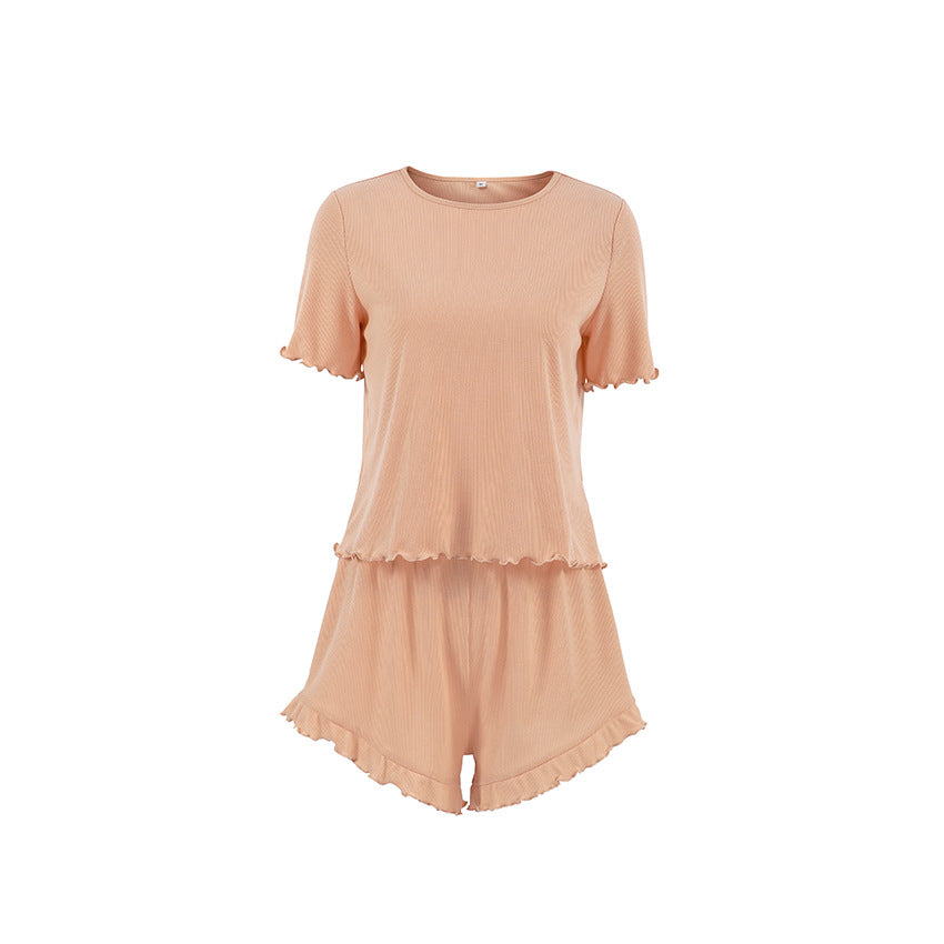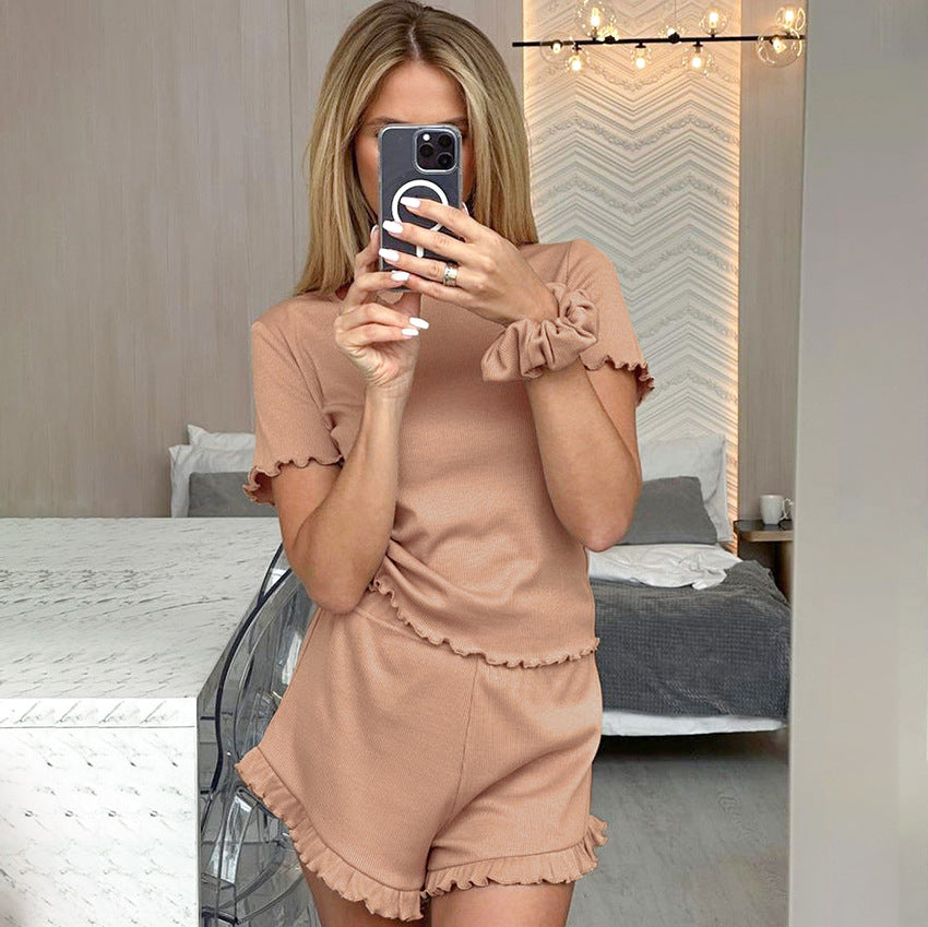 Opdag det perfekte outfit til afslappede dage derhjemme med vores damesofe lounge-sæt med flæsedetaljer og elastisk talje fra Stilla. Dette komfortable sæt består af en stilfuld top og Matchende shorts, ideelt til et afslappet look, der stadig ser chikt ud.