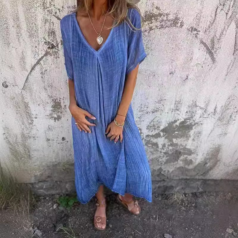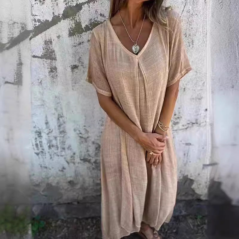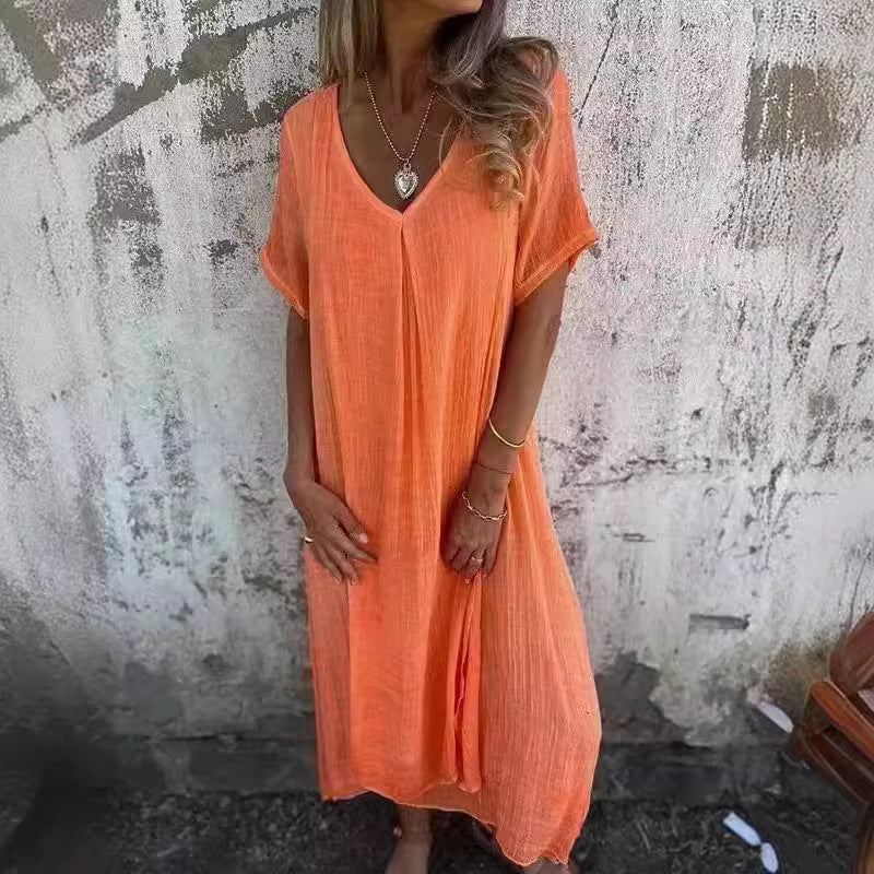 Opdag vores dameslætte maxikjole, der er perfekt til varme sommerdage. Fremstillet af et let og åndbart materiale, tilbyder det maksimal komfort og en elegant silhuet.