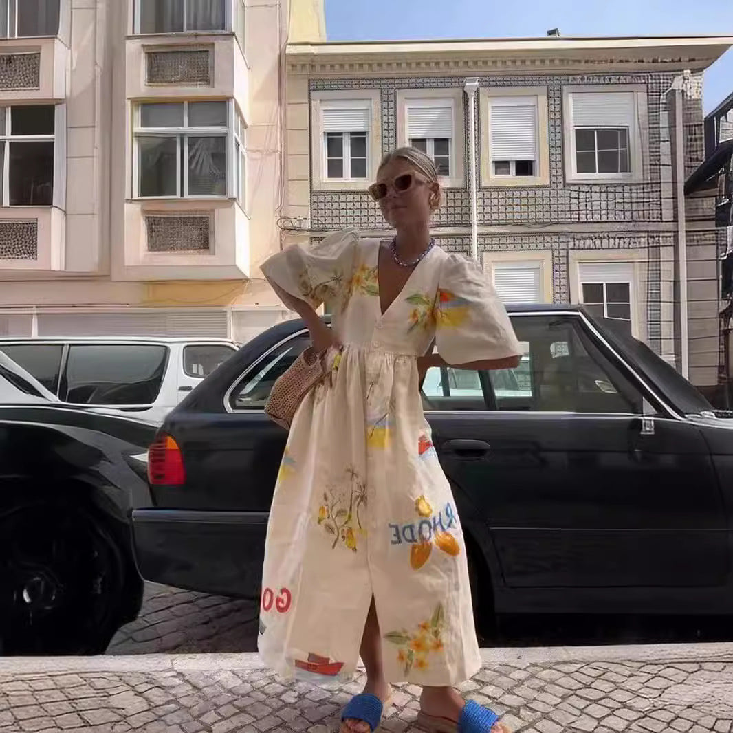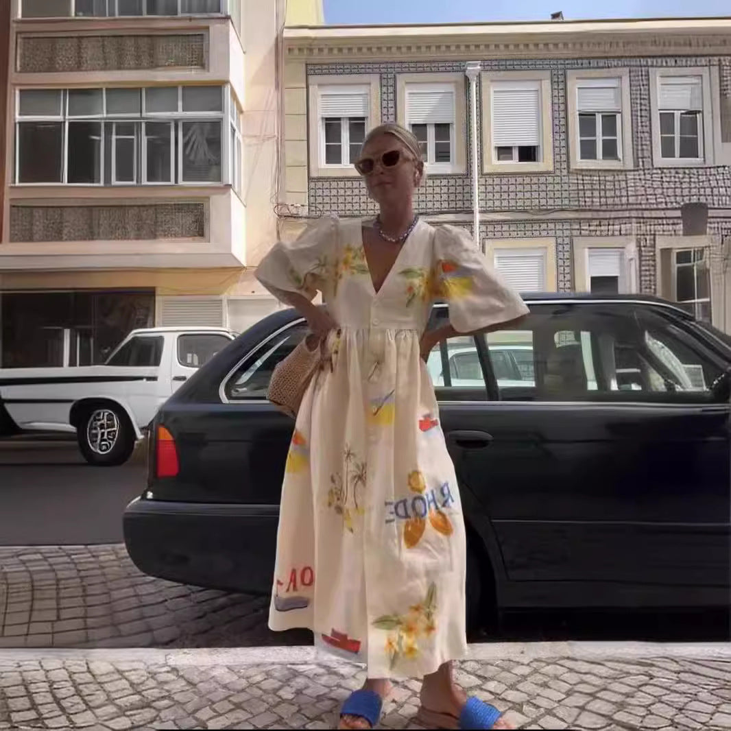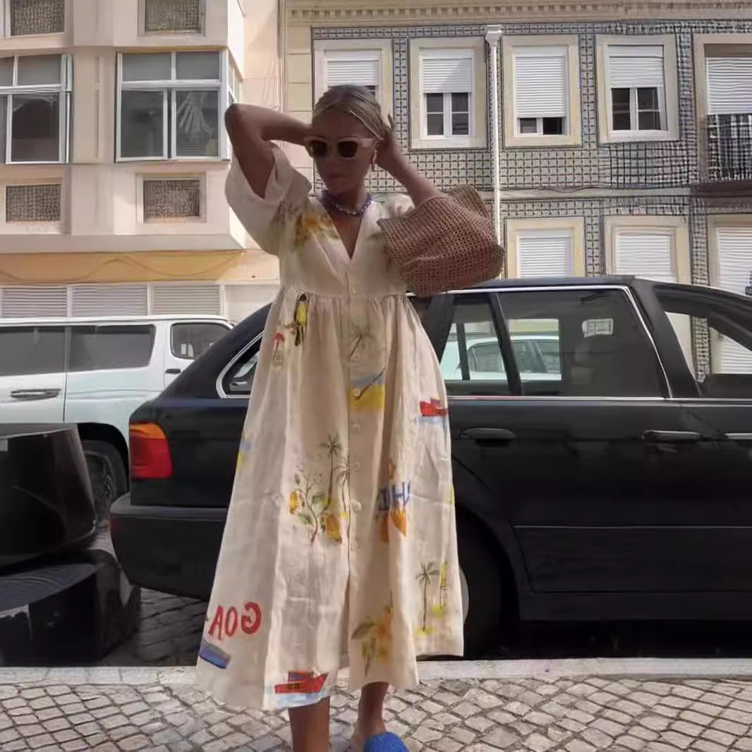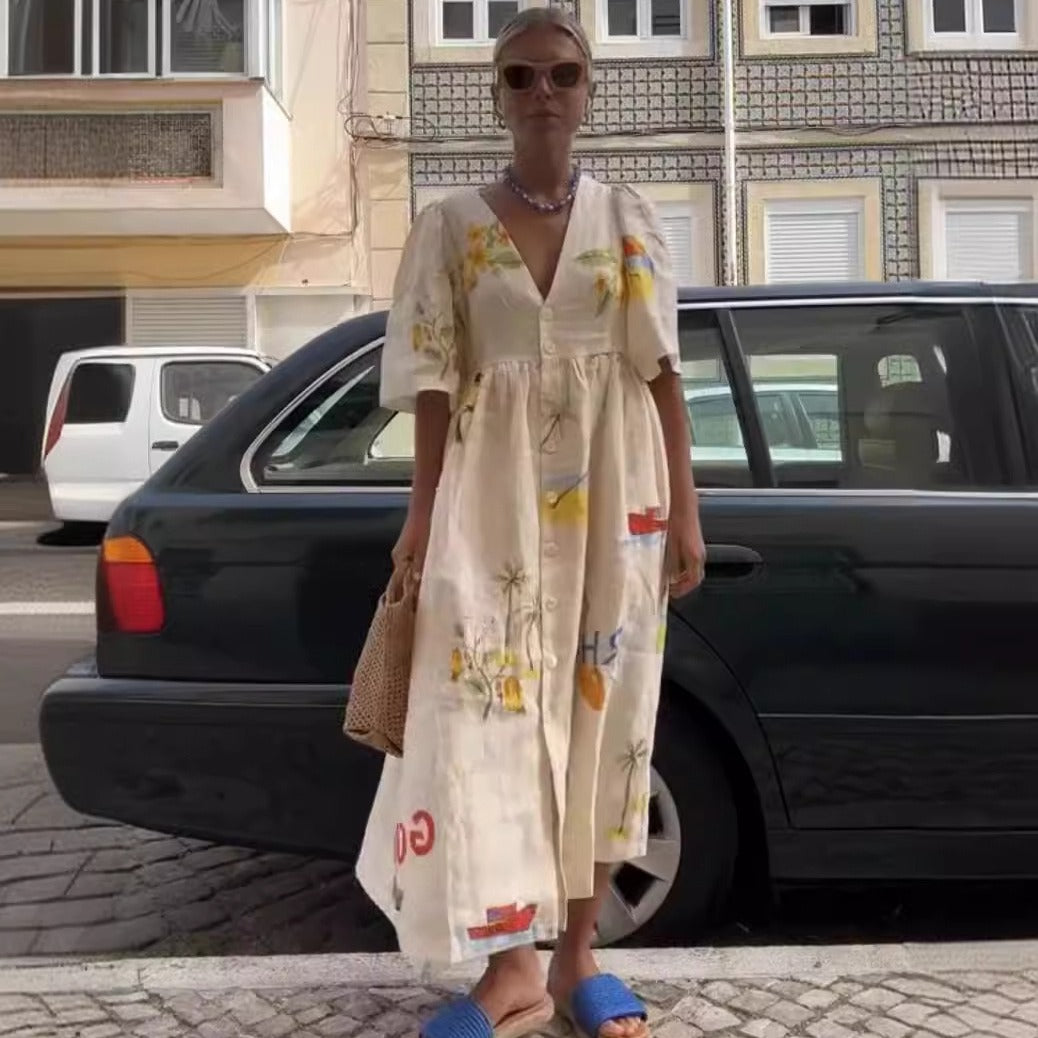 Opdag vores dames afslappede maxikjole med blomsterprint og knapdetaljer fra Stilla, der forener elegance og komfort. Denne kjole er perfekt til varme sommerdage og giver et stilfuldt look til enhver lejlighed.