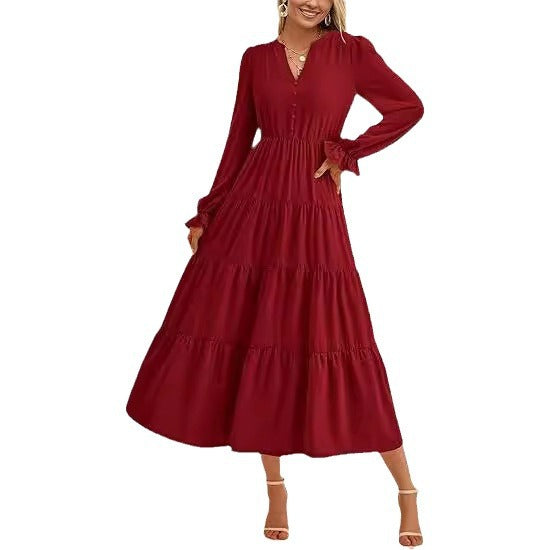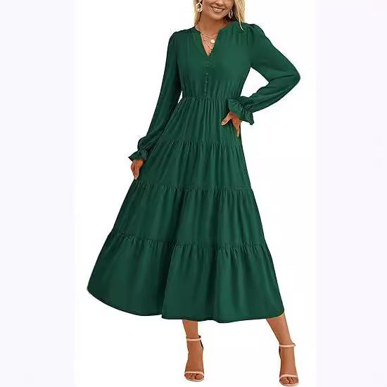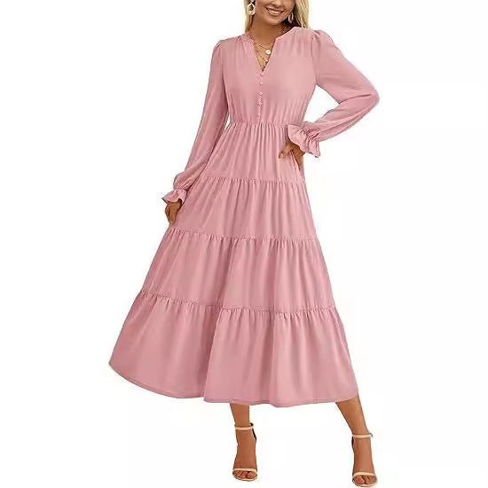 Opdag vores stilfulde, afslappede maxikjole, der forener både komfort og elegance. Denne kjole imponerer med sit flatterende volangdesign og den praktiske knaplukning, der giver den et moderne præg. Ideel til varmt vejr, perfekt til afslappede sammenkomster eller særlige anledninger.