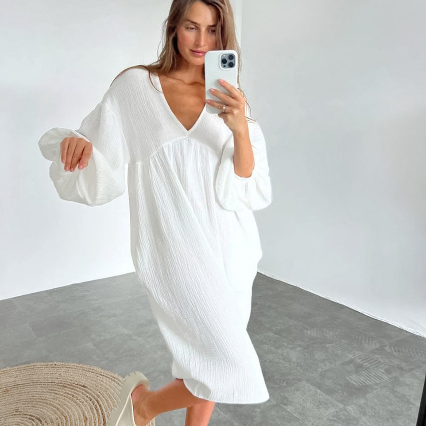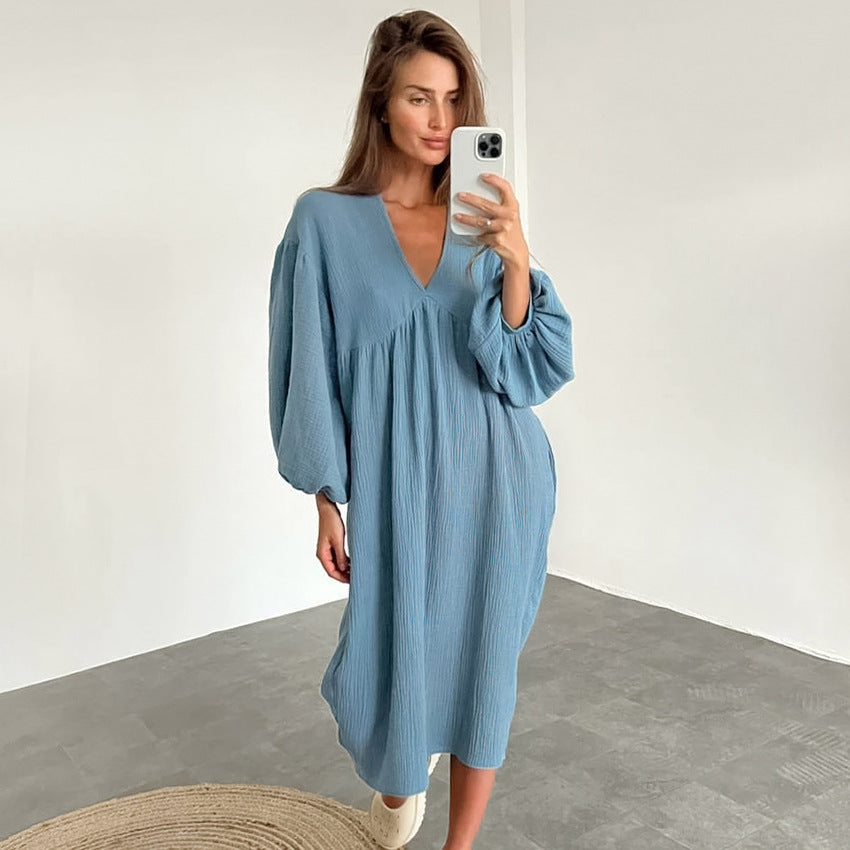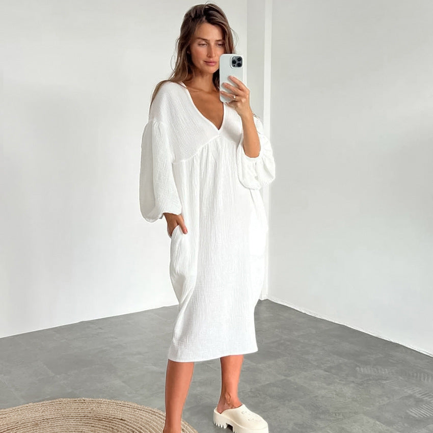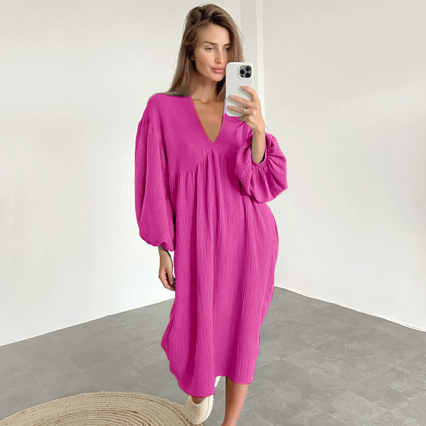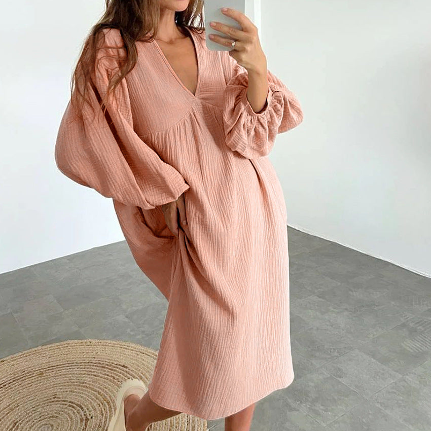 Opdag vores damesætte midi-kjole med dyb V-udskæring og ballonformede ærmer, der vil blive dit nye yndlingsstykke til enhver lejlighed. Den innovative materialekombination sikrer en let, luftig bærekomfort, ideel til varme dage eller afslappede aftener.