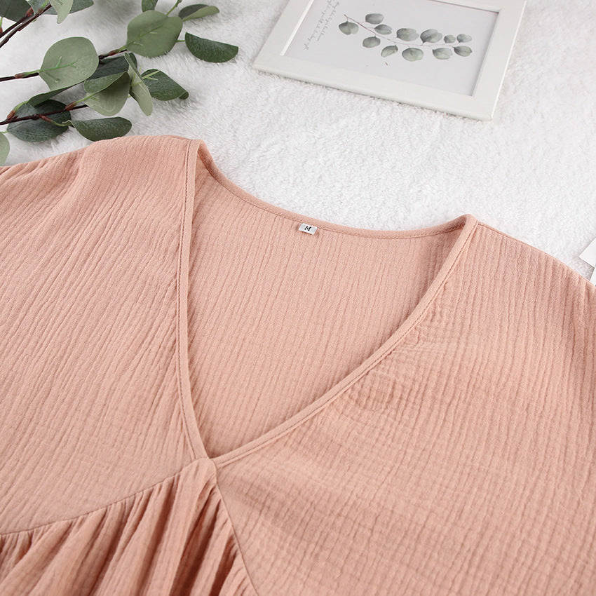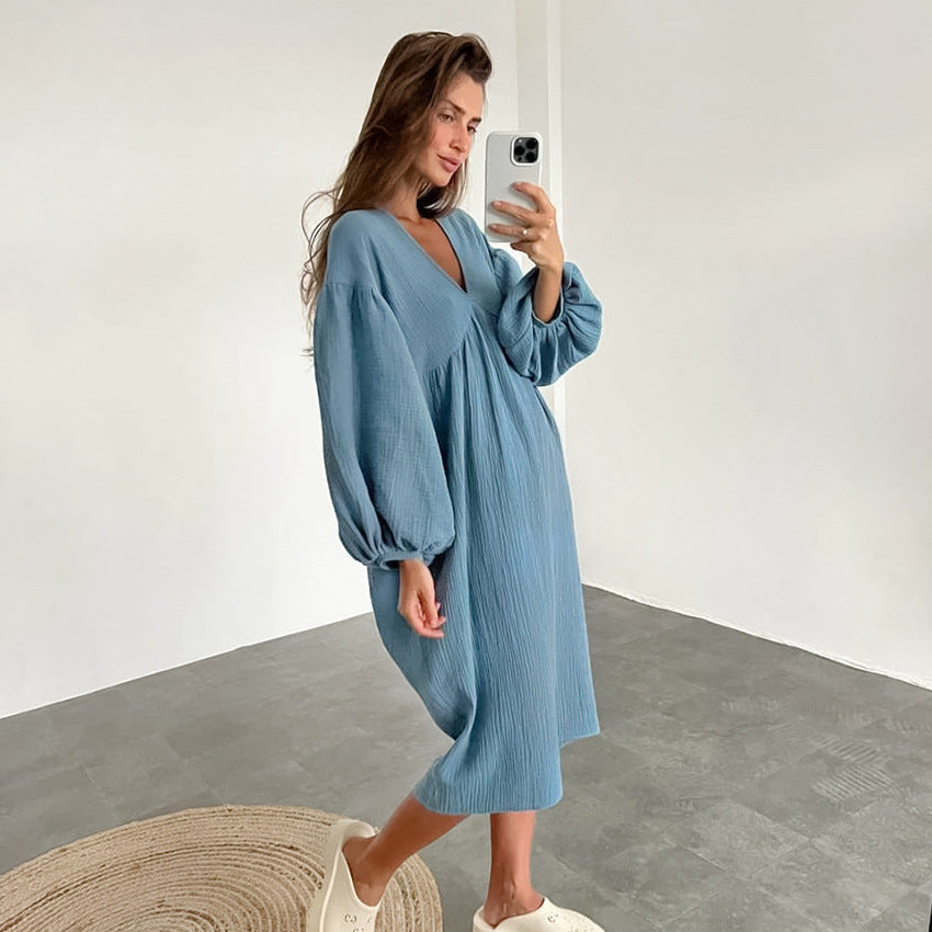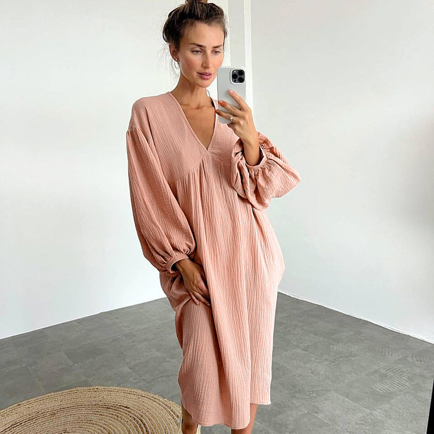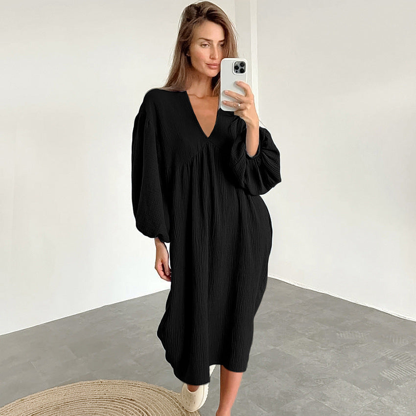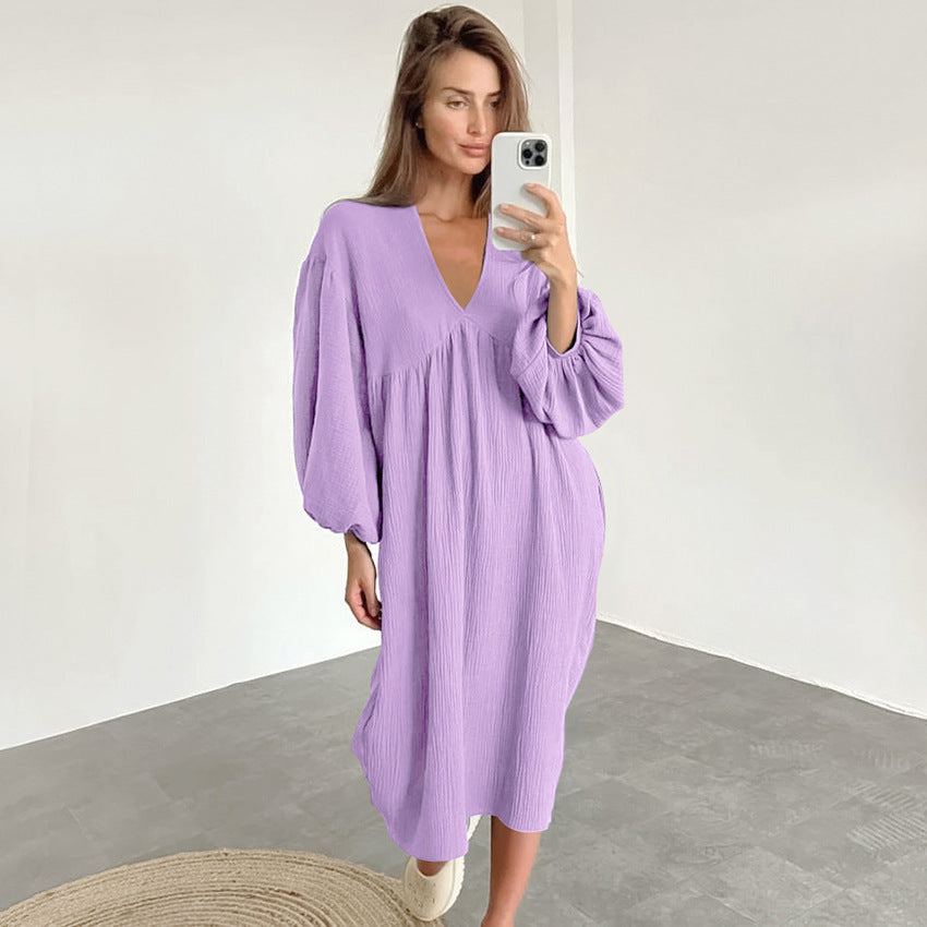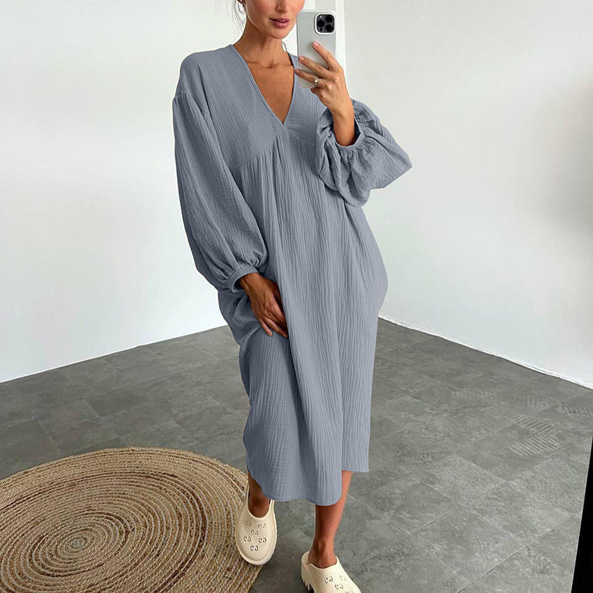 Opdag vores damesætte midi-kjole med dyb V-udskæring og ballonformede ærmer, der vil blive dit nye yndlingsstykke til enhver lejlighed. Den innovative materialekombination sikrer en let, luftig bærekomfort, ideel til varme dage eller afslappede aftener.