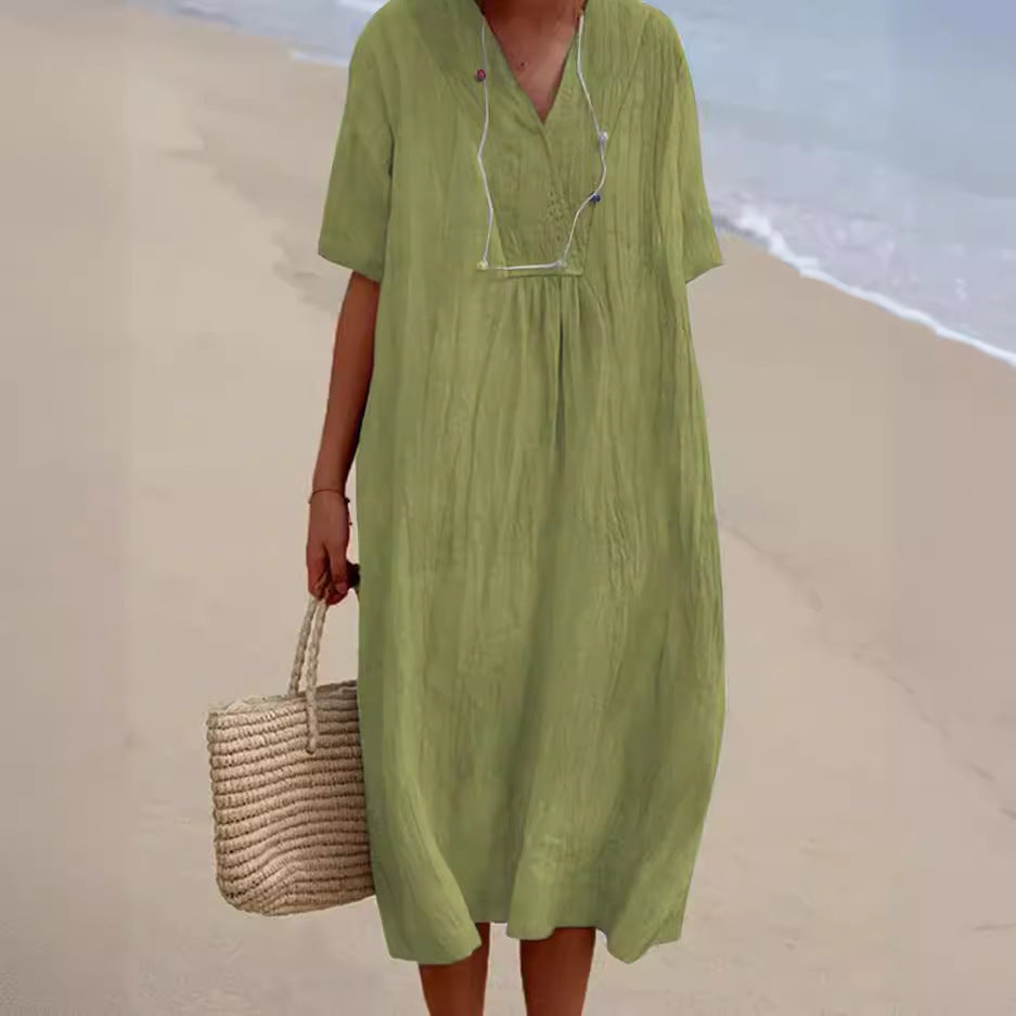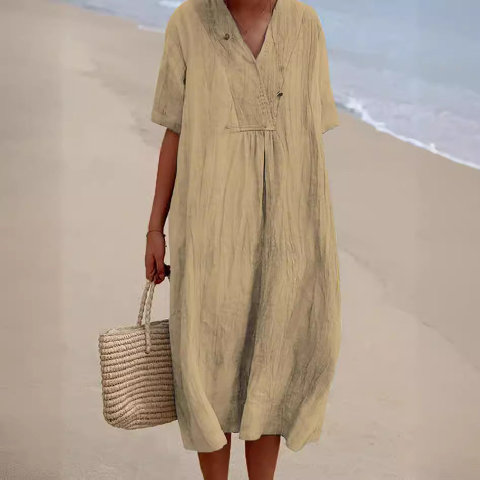 Vores afslappede midikjole imponerer med en moderne V-hals og praktiske sidelommer. Den løse pasform sikrer optimal bærekomfort, mens det åndbare materiale er ideelt til varme dage.