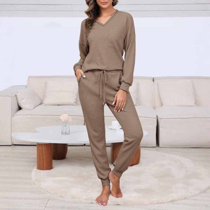 Oplev vores stilfulde dames lounge-sæt, der er både behageligt og elegant på samme tid. Dette sæt består af en afslappet top med V-hals og et tilsvarende underdel, der giver perfekt bærekomfort. De praktiske lommer i begge dele giver ekstra funktionalitet og stil.