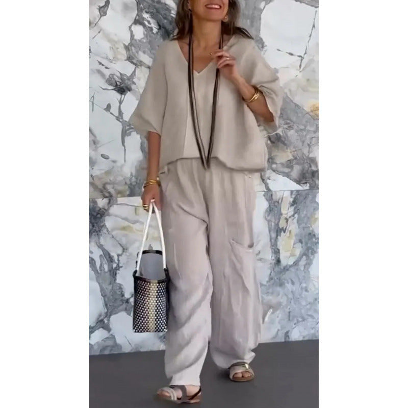 Opdag vores dames afslappede og elegante to-delt sæt lavet af åndbart materiale, der er ideelt til varme sommerdage. Dette sæt kombinerer komfort med stilfuldt design og tilbyder dig den perfekte løsning til både afslappede og stilfulde anledninger.