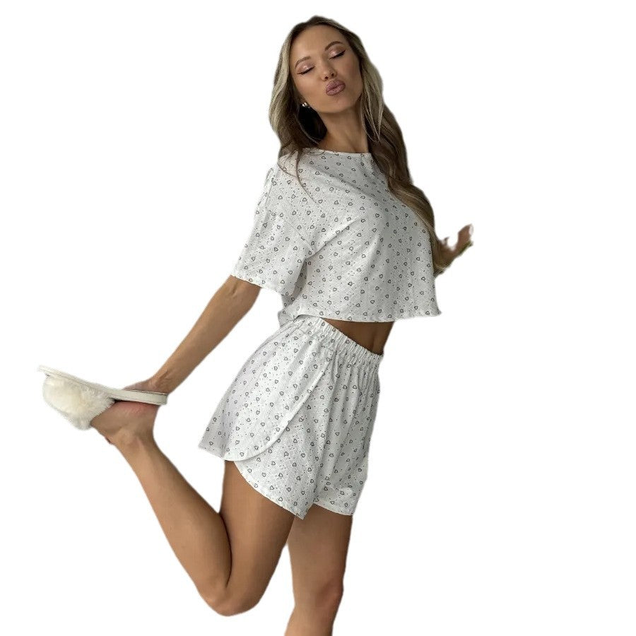 Opdag det perfekte outfit til afslappede dage med vores dames afslappede og luftige lette kortærmet sæt med V-hals og hjerte-motiv fra Stilla. Dette sæt forener komfort og stil på ideel vis og passer både til hjemme og til afslappede udflugter.