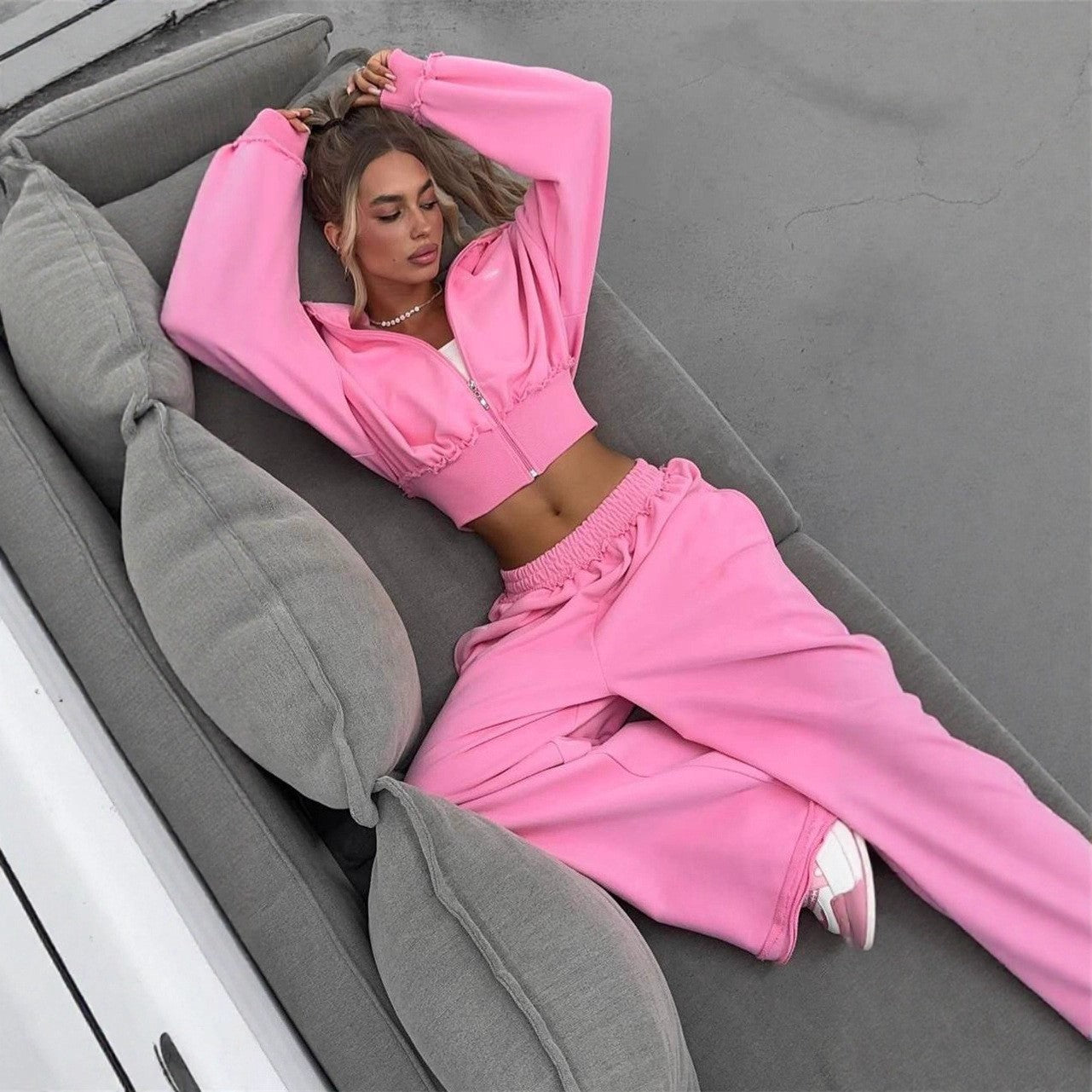 Sættet inkluderer en kort, løs top med flæser, der giver et sporty samt feminint udtryk. De rummelige bukser sikrer optimal komfort og fri bevægelse, mens den elastiske talje giver en perfekt tilpasning.