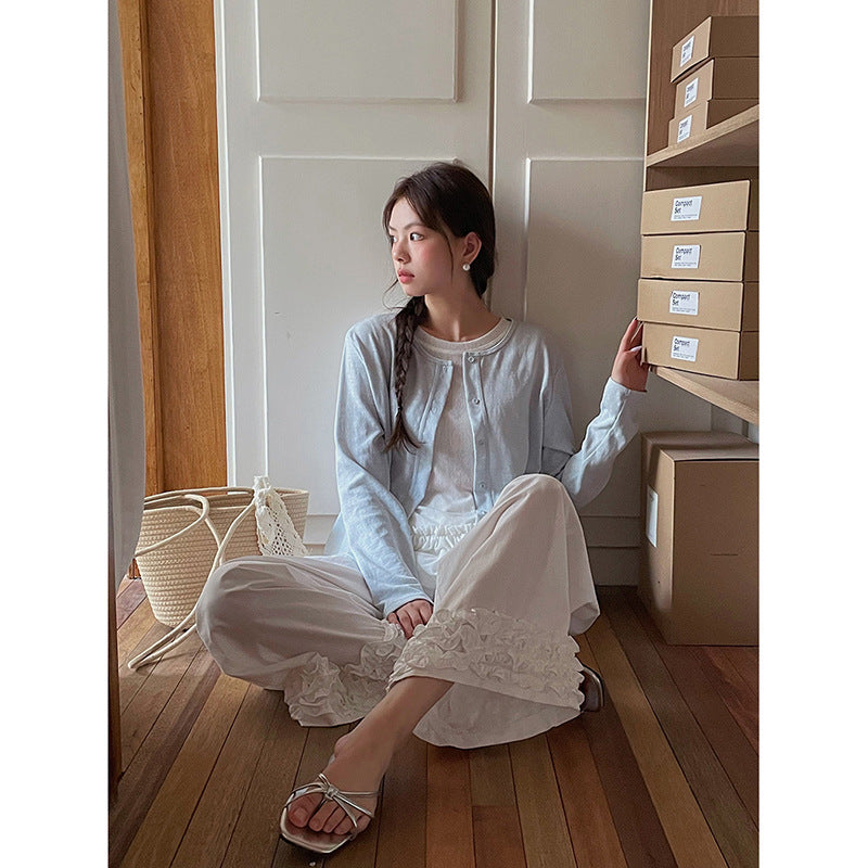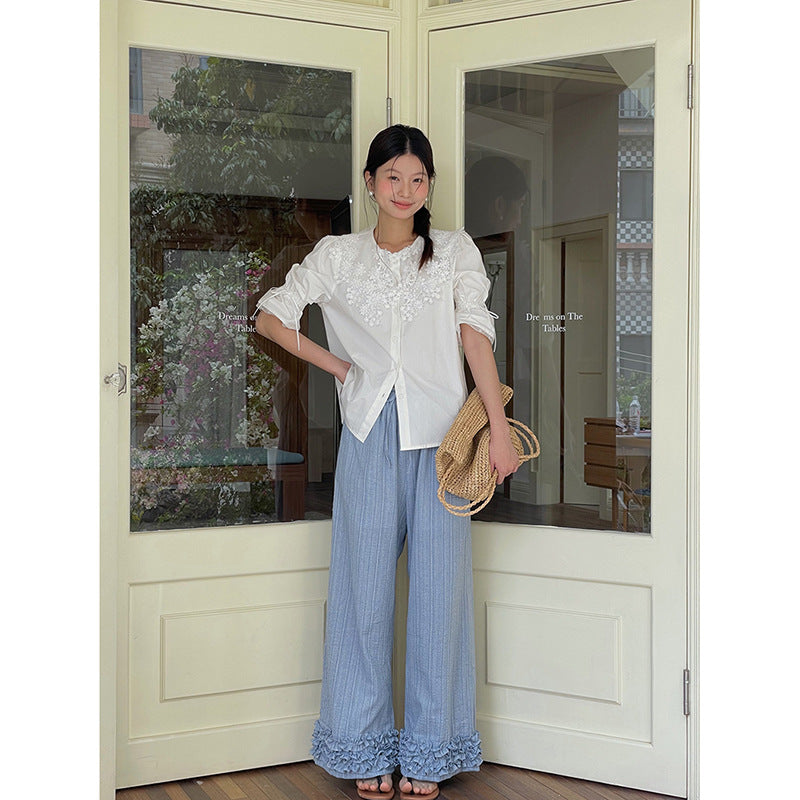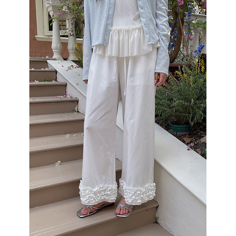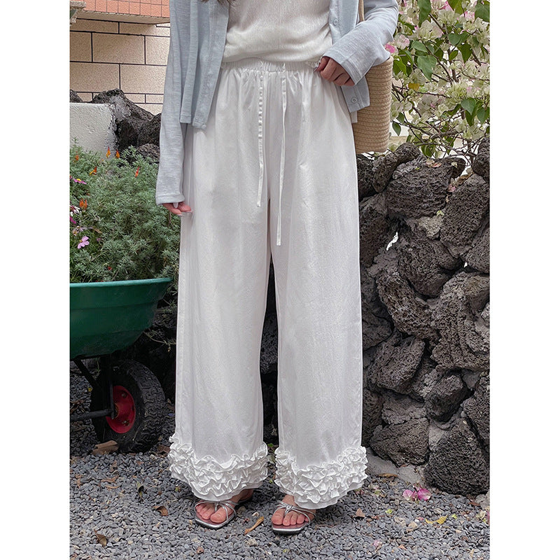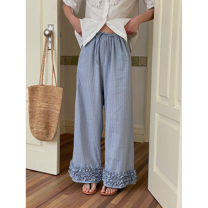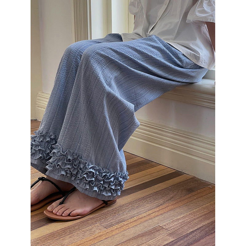 Opdag den perfekte kombination af komfort og stil med vores afslappede palazzo-bukser til damer. Disse bukser skiller sig ud med deres generøse benform og de modebevidste flæsedetaljer ved kanten, som tilføjer et strejf af elegance til ethvert outfit.