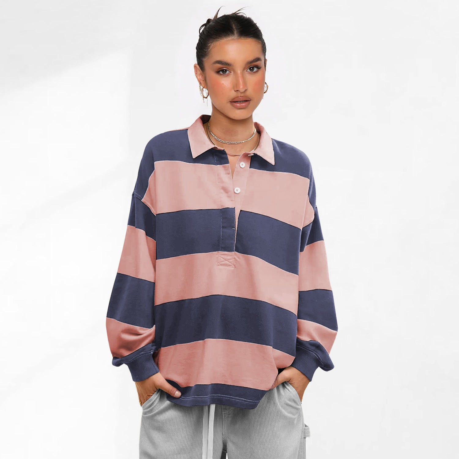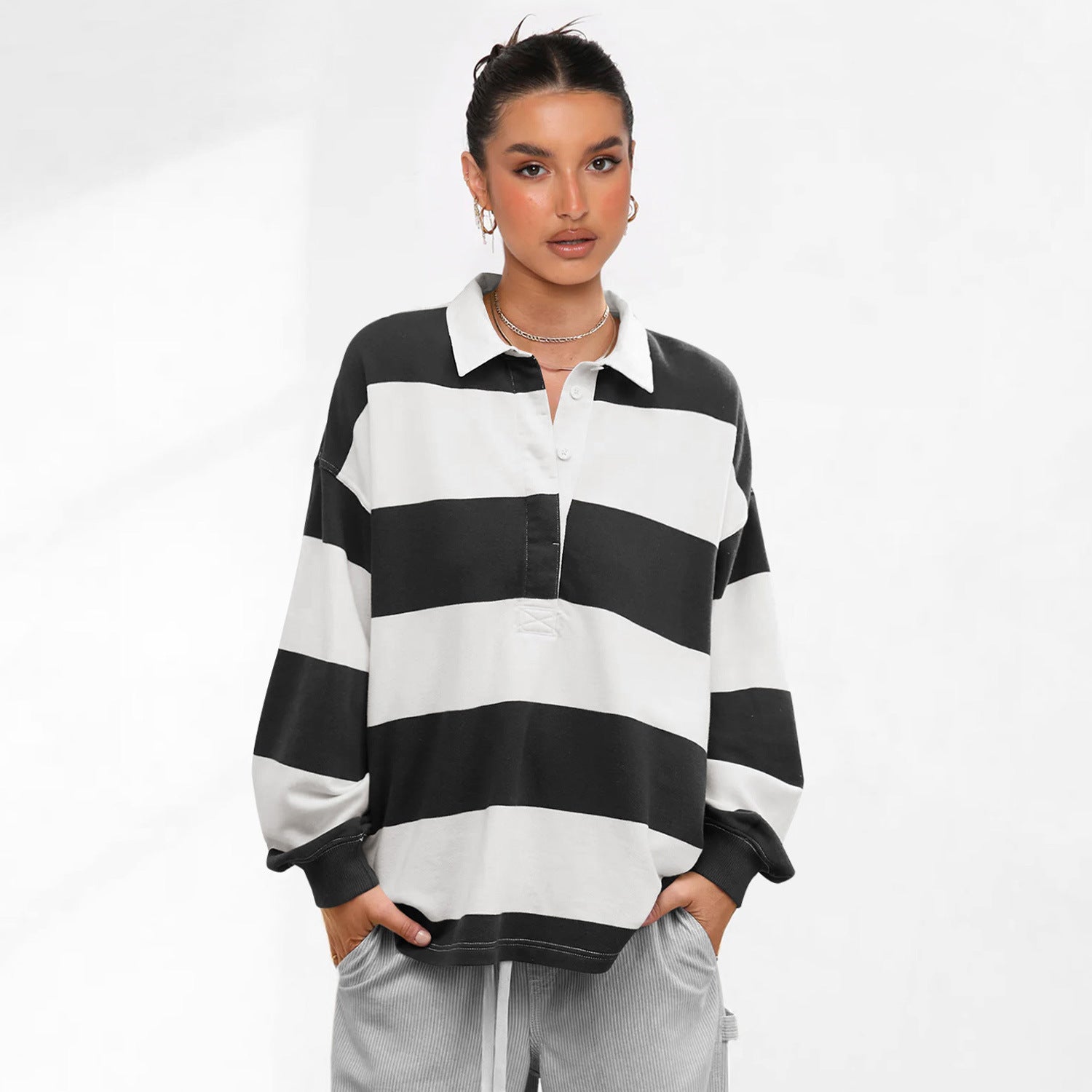 Oplev vores dames afslappede polo shirt i plus størrelse med kontrasterende striber fra Stilla, der kombinerer perfekt komfort med moderne stil. Denne skjorte er ideel til hverdag og kan styles på mange forskellige måder.