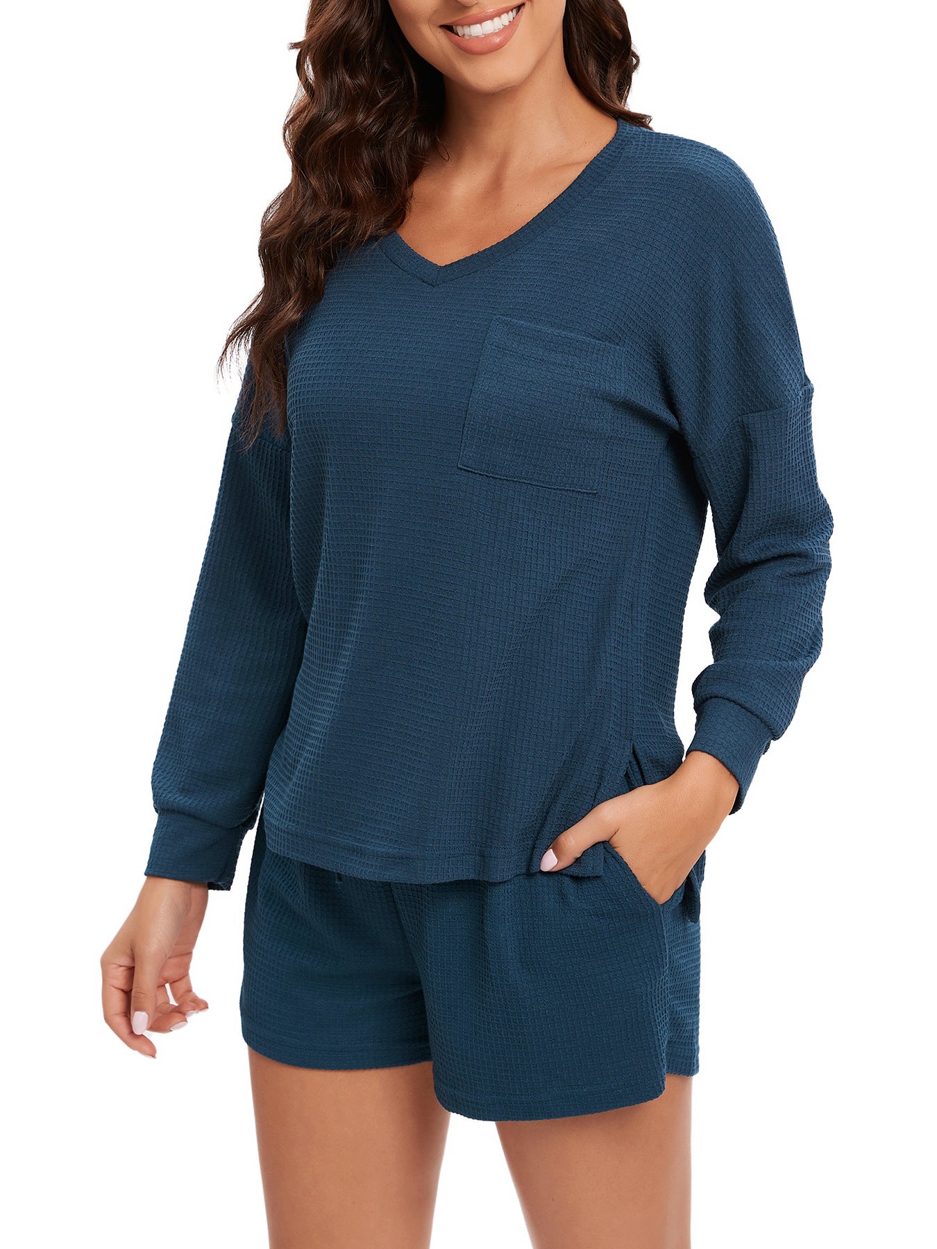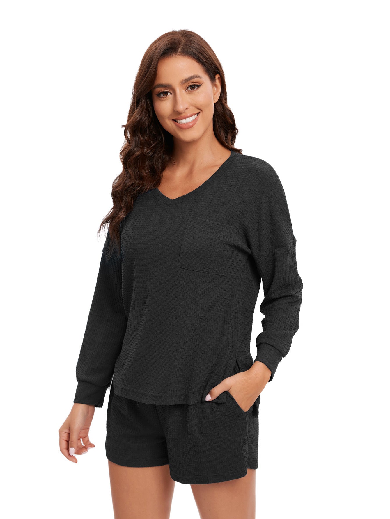 Opdag vores Dame afslappede pyjamasæt, der består af en langærmet top og behagelige shorts. Dette sæt er ideelt til afslappede aftener såvel som hyggelige nætter. Det blødt vævede materiale sikrer optimal bærekomfort og åndbarhed.
