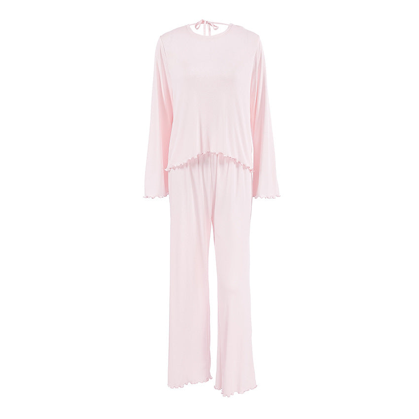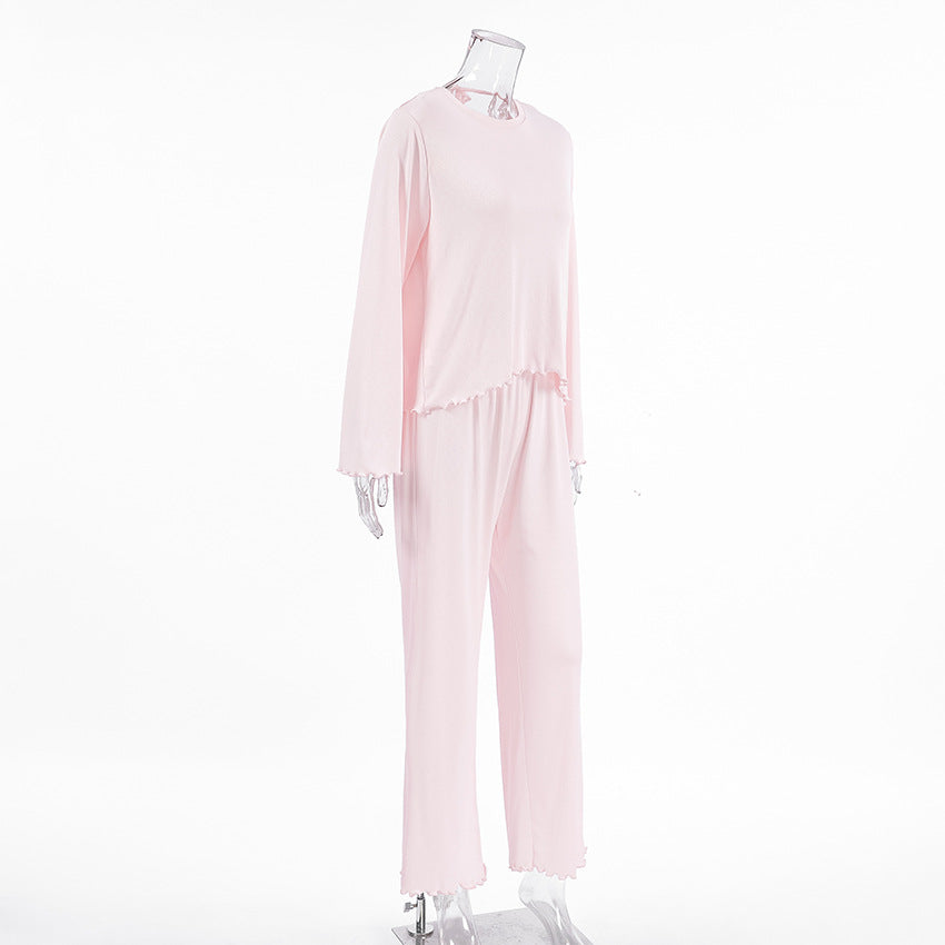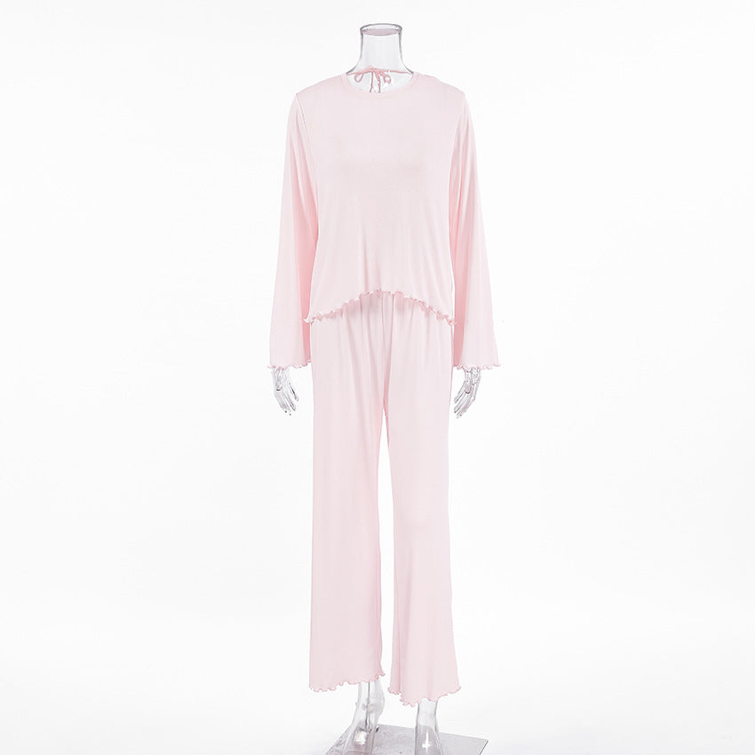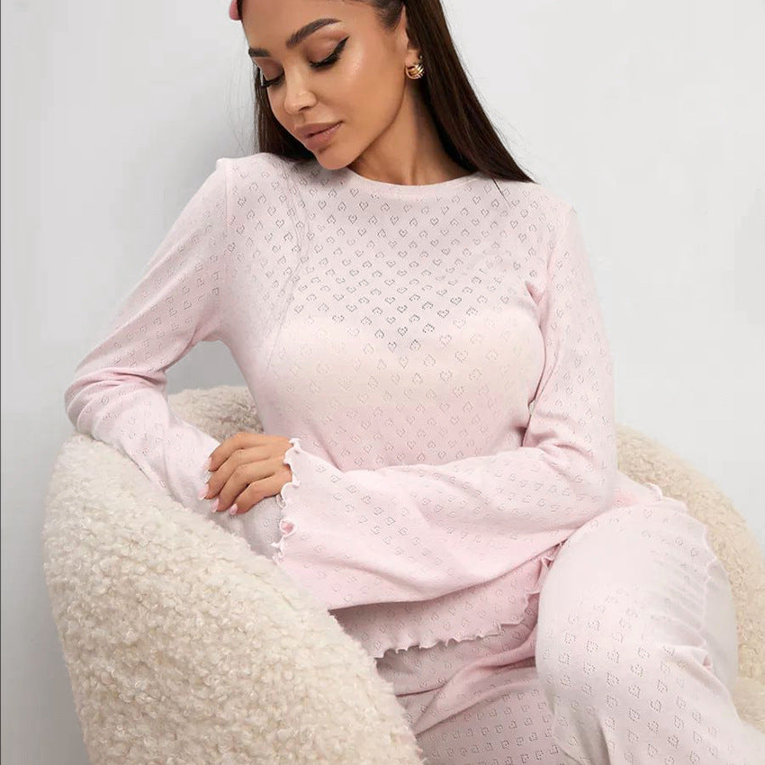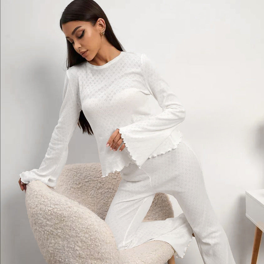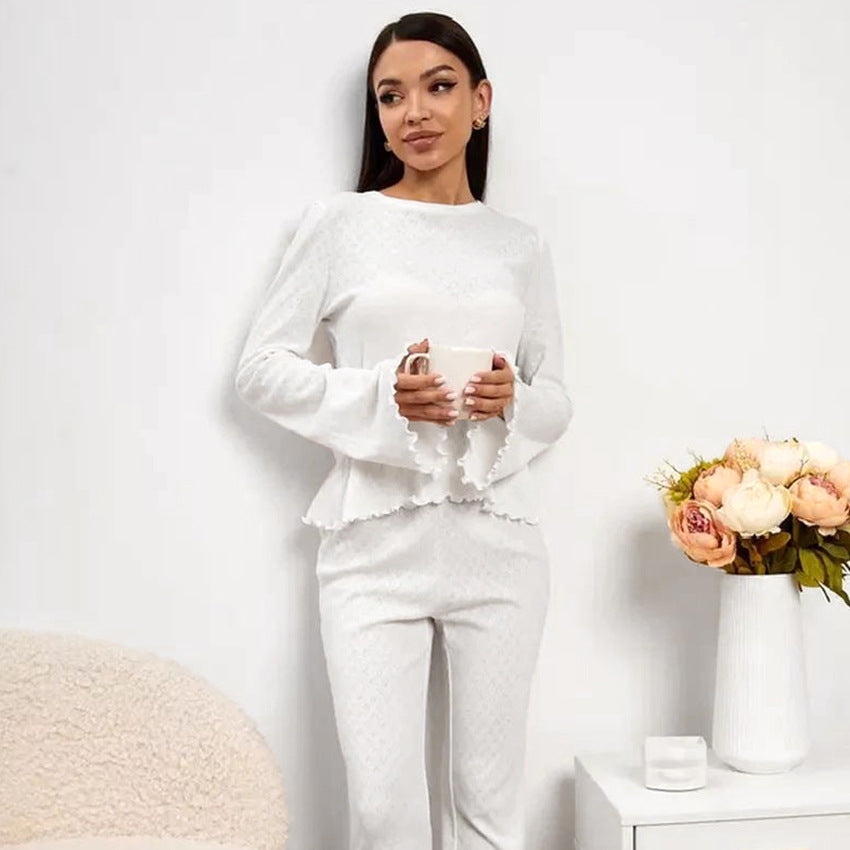 Opdag vores stilfulde og komfortable dametøjssæt, der er specielt designet til afslappende nætter og hyggelige dage. Med et elegant design og kvalitetsmaterialer giver dette sæt optimal komfort. Rundhalssnittet og de smukke flæsedetaljer på ærmet giver toppen et legende præg.