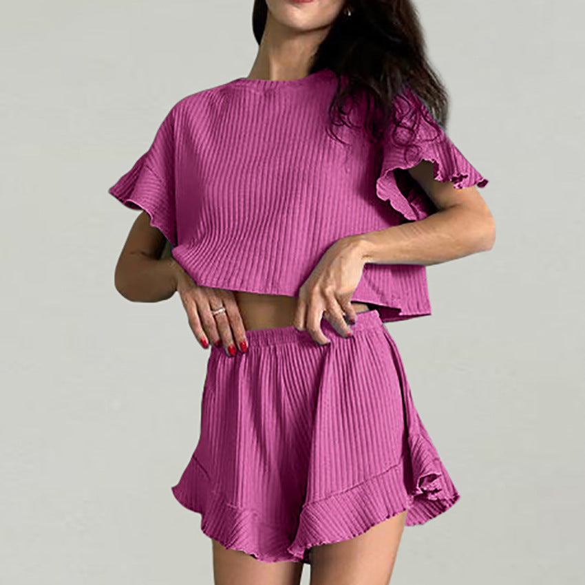 Opdag vores stilfulde dames afslappede rib sæt med voluminøse ærmer og frynseafslutninger, der er perfekt til afslappede sommerdage. Dette ensemble kombinerer komfort med modeflair og kan nemt styles.