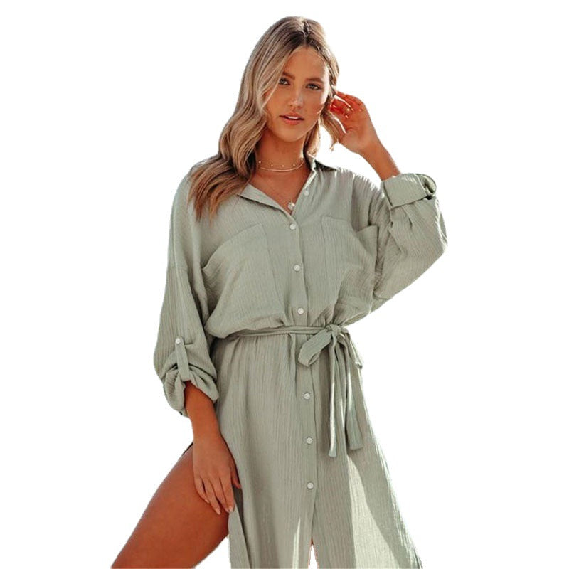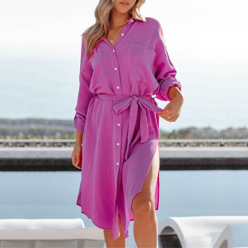 Oplev vores feminine casual skjortekjole med taljebælte og asymmetrisk kant fra Stilla. Denne stilfulde kjole kombinerer komfort og elegance og er perfekt til mange lejligheder, om det er på stranden eller til en bytur.