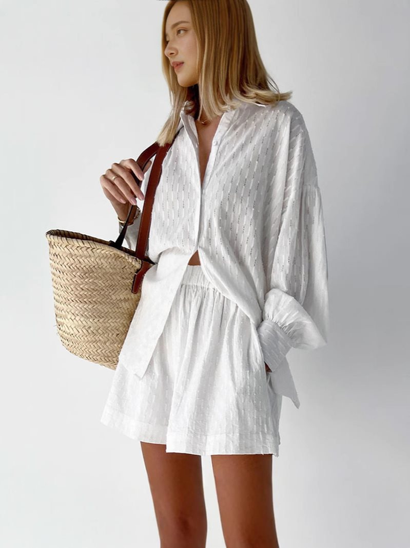 Opdag vores dames afslappede skjorte-bukser sæt med dekorativ struktur, der giver dig et afslappet og samtidig stilfuldt look. Dette sæt er ideelt til varme dage og tilbyder en perfekt kombination af komfort og moderigtigt design.
