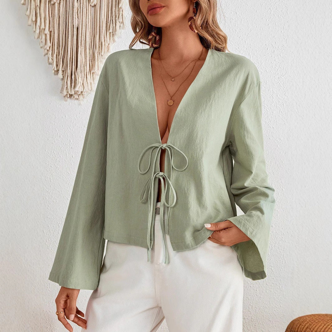 Udforsk vores trendy damestrikjakke, der forener komfort og stil. Denne jakke har en dyb V-udskæring, der ikke kun er moderne, men også særligt flatterende. Med det praktiske sløjfe-lukning kan jakken tilpasses individuelt, hvilket gør den velegnet til både afslappede anledninger og særlige begivenheder.