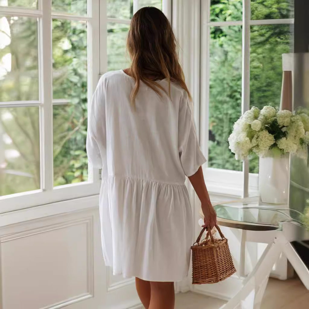 Opdag vores charmerende dameskjorte-kjole, det perfekte outfit til afslappede sommerdage. Denne kjole imponerer med sin afslappede stil og det åndbare bomuldsstof, der giver ultimativ komfort.