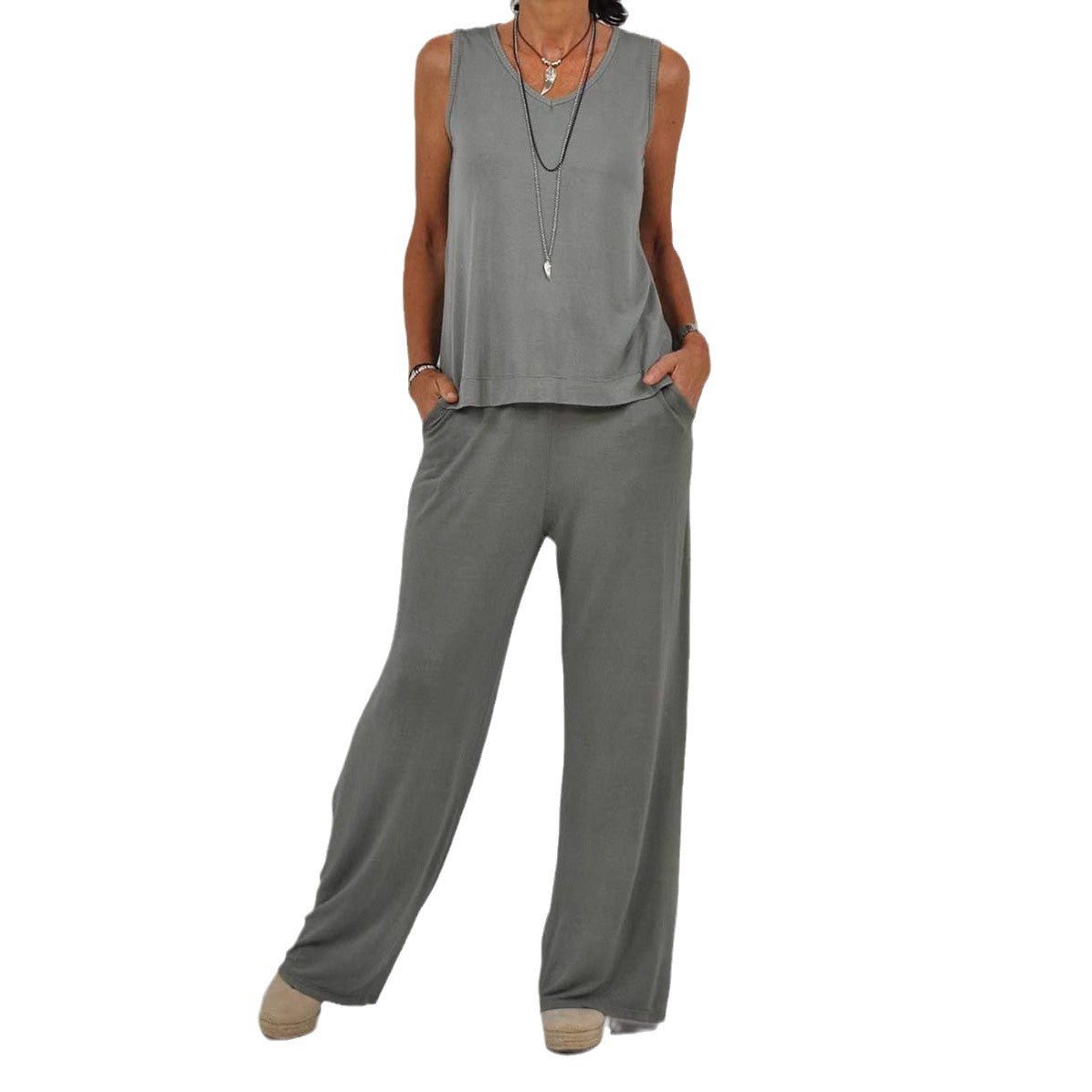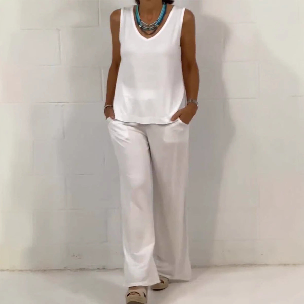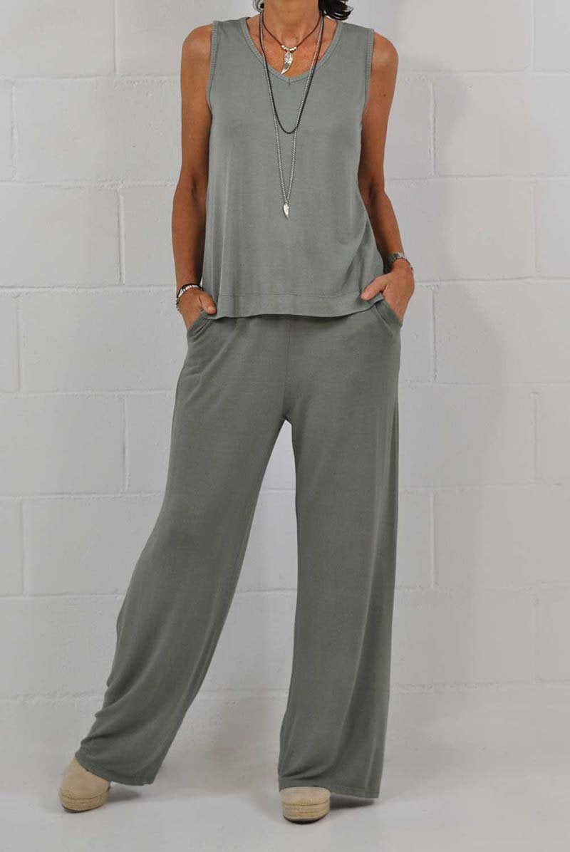 Nyd de varme dage med vores afslappede sommeroutfit, som forener stil og komfort. Outfitet består af en ærmeløs top med V-udskæring og et vidt snit bukser, der er perfekt til afslappede udflugter.