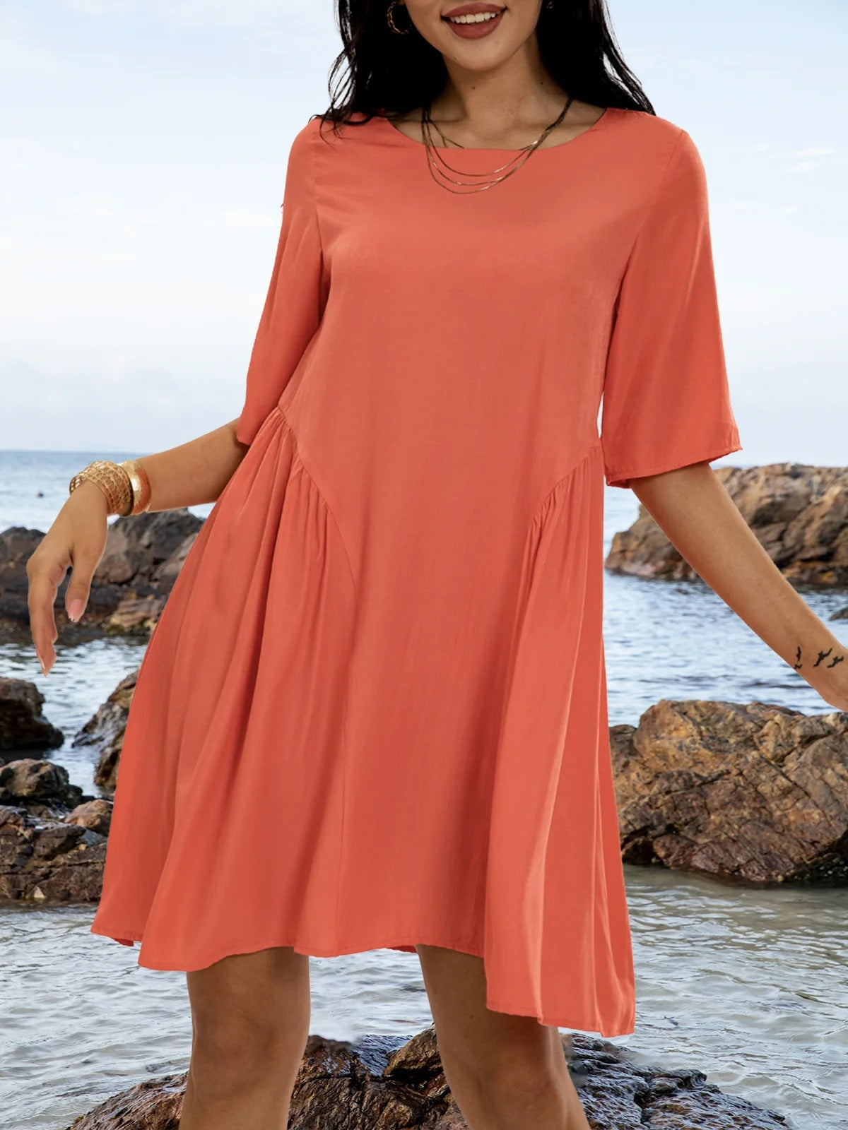 Opdag vores nye dame casual sommerkjole, der forener både stil og komfort. Denne kjole tilbyder en generøs, vidt svingende nederdel, der giver dig den nødvendige bevægelsesfrihed til varme dage. Den behagelige bomulds kvalitet sikrer, at du føler dig frisk og godt tilpas hele dagen.