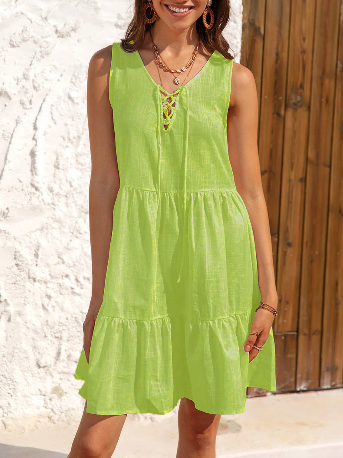 Oplev sommeren i vores afslappede sommerkjole fra Stilla, der med et raffineret snøredetail på fronten giver et trendy touch. Lavet af et let, åndbart materiale, giver denne kjole den bedste bærekomfort, mens du ser stilfuld ud på varme dage.