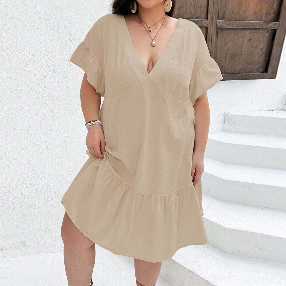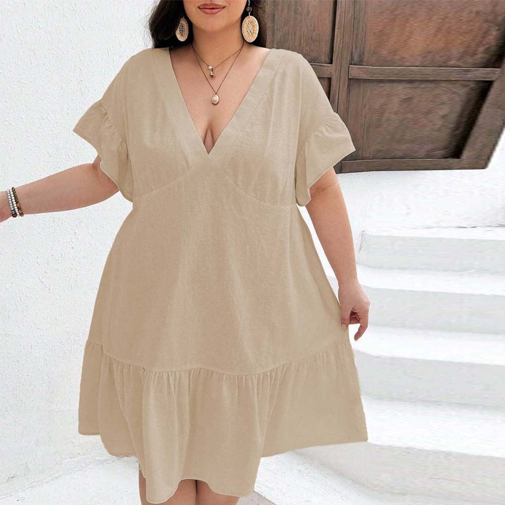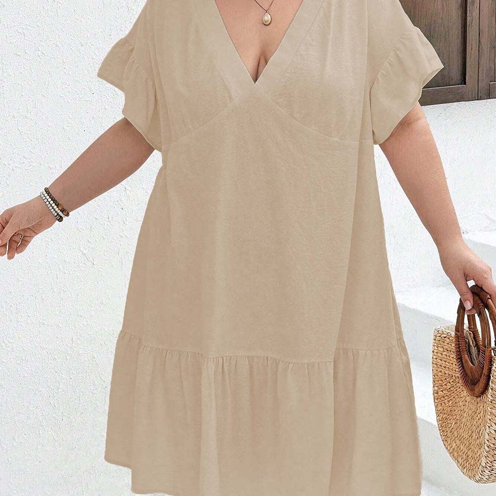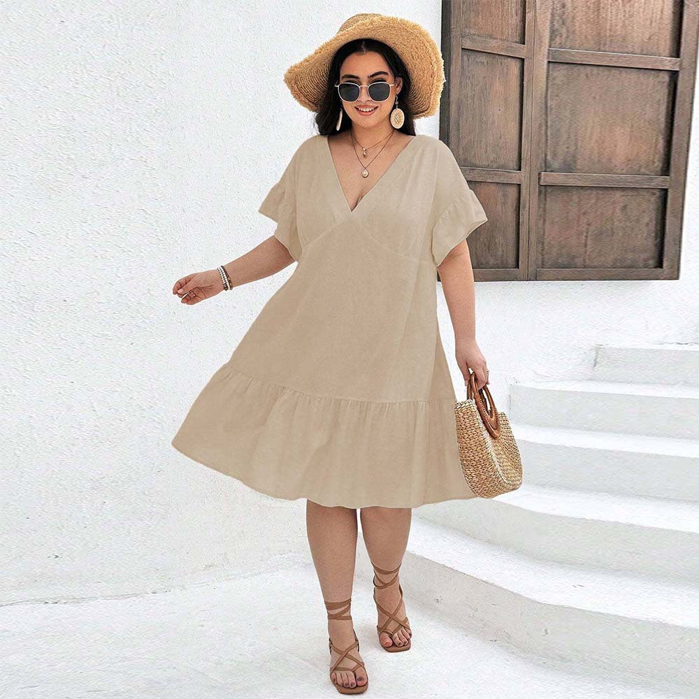 Opdag Stilla' damesommerkjole med V-hals og flæsekanter – den perfekte kjole til varme dage og særlige anledninger.