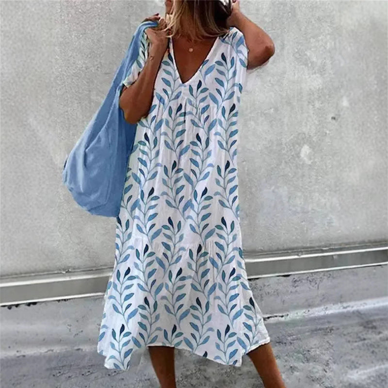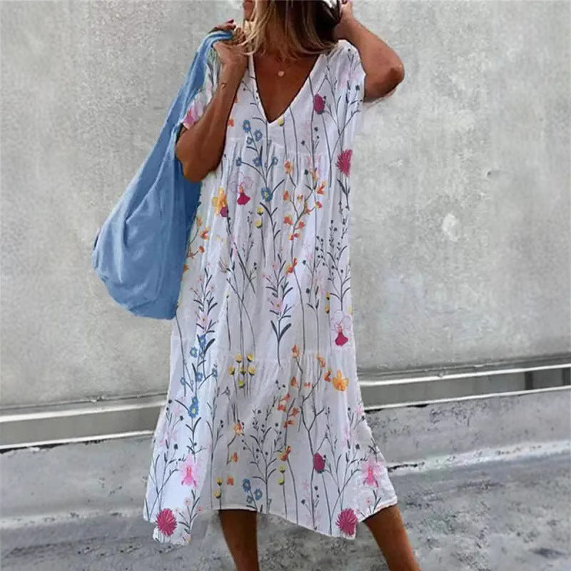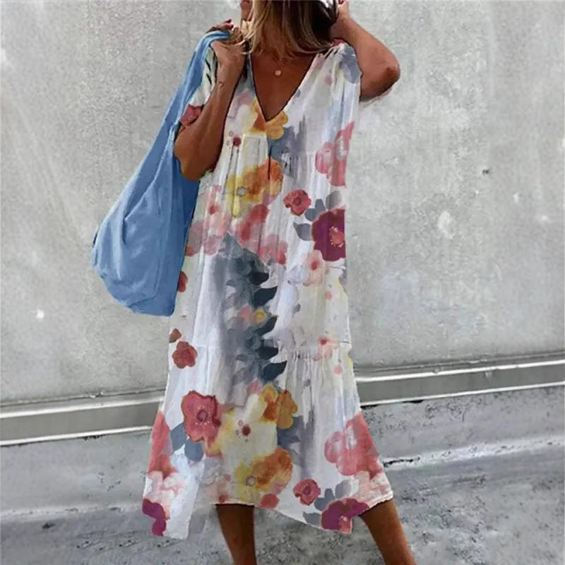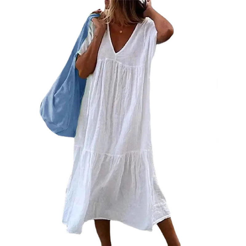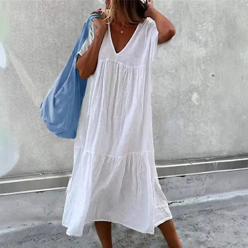 Opdag vores damesimple sommerkjole med V-udskæring og flæsedetaljer fra Stilla. Denne smukke kjole er perfekt til varme dage, enten på stranden eller til en afslappet bytur.