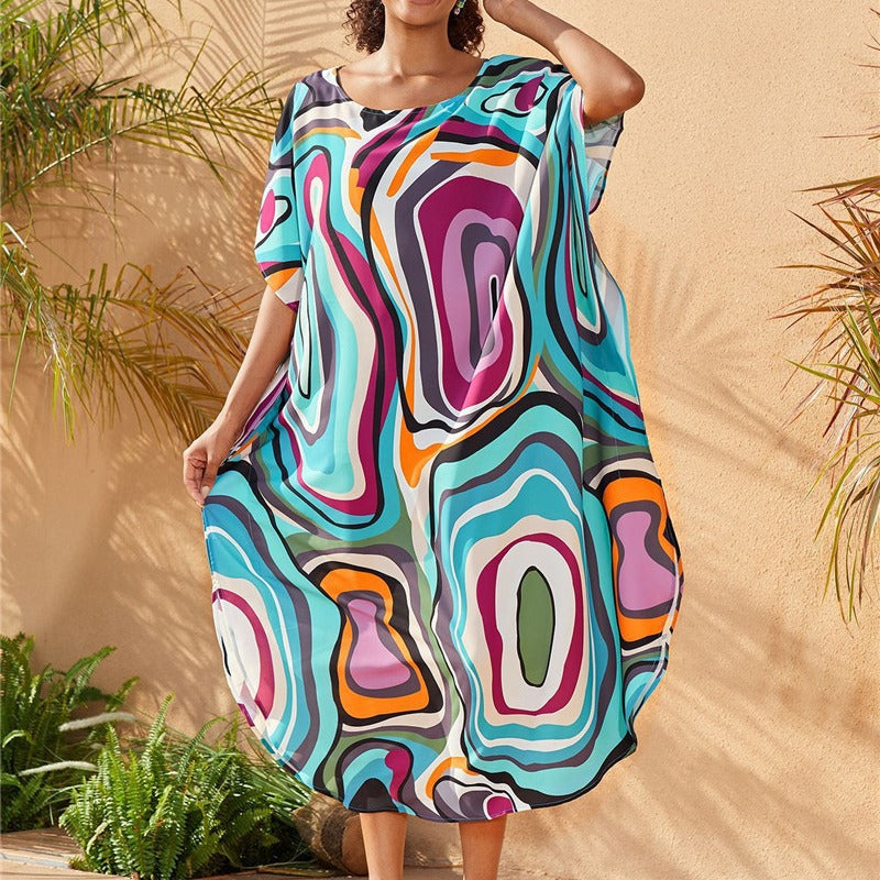 Denne elegante kvinders strandfrakke fra Stilla er perfekt til solrige dage på stranden eller ved poolen. Med et iøjnefaldende kunstnerisk grafisk mønster tilføjer denne løst siddende frakke farve og stil til din sommergarderobe.