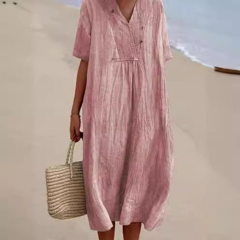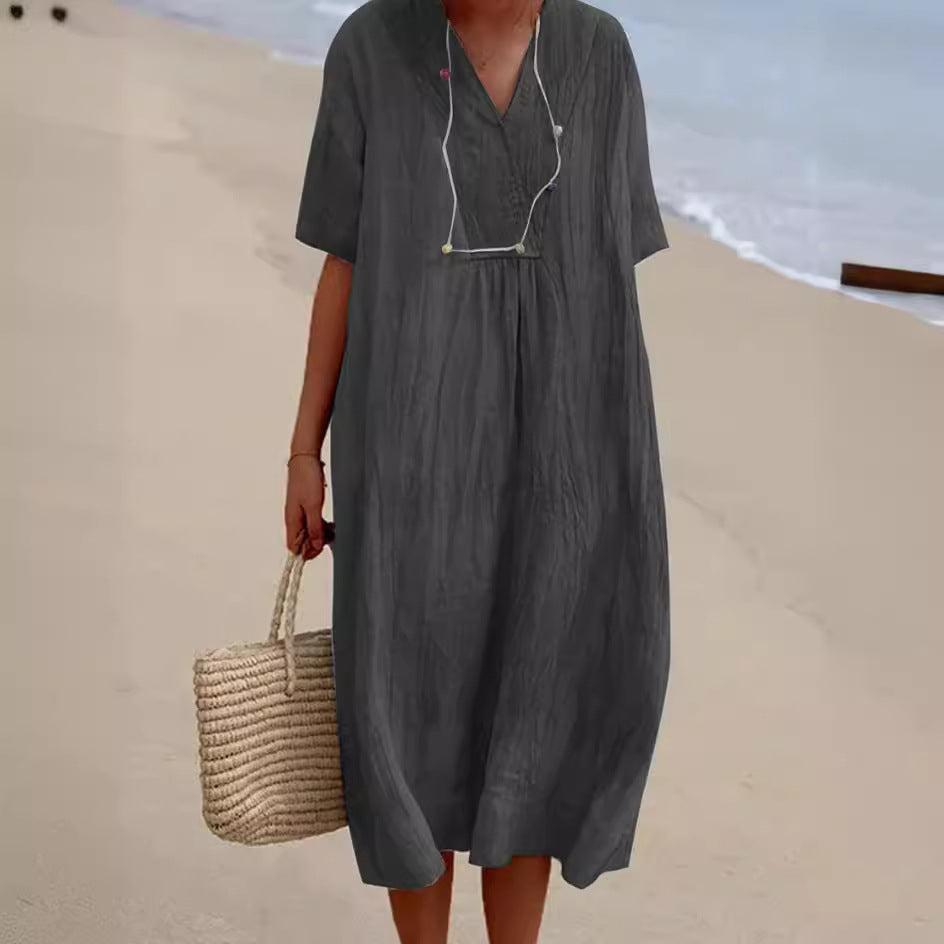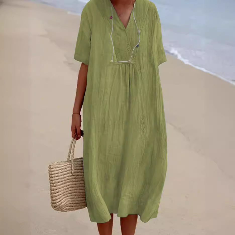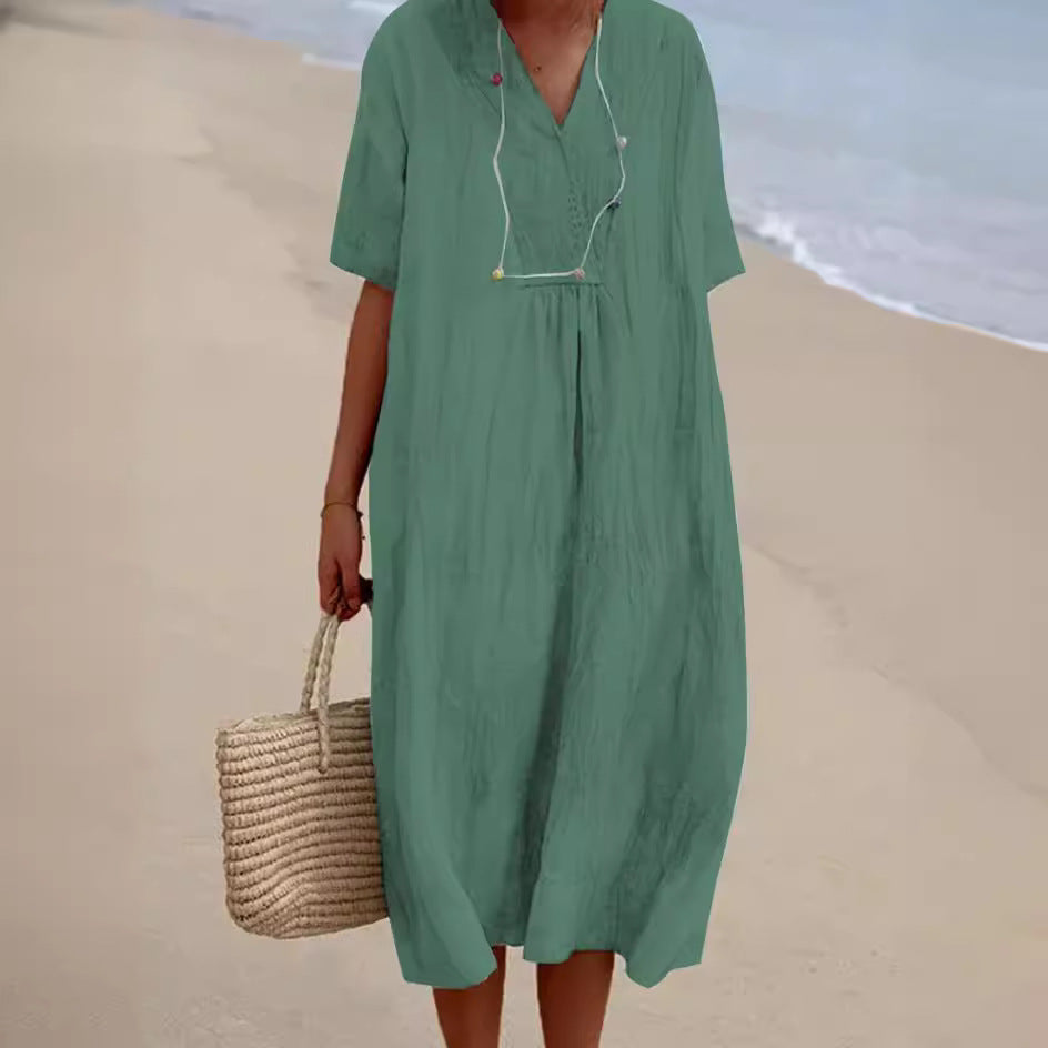 Opdag vores elegante dame strandkjole, der tilføjer et strejf af stil til enhver sommergarderobe. Denne kjole imponerer med sin dybe V-udskæring og løse silhuet, der sikrer en luftig pasform. Den er lavet af let, åndbart materiale, der giver optimal bærekomfort ved varme temperaturer.